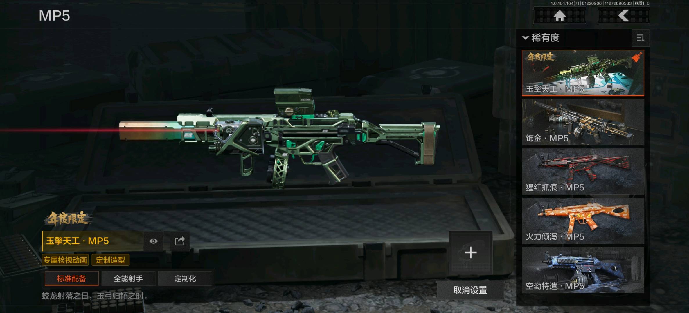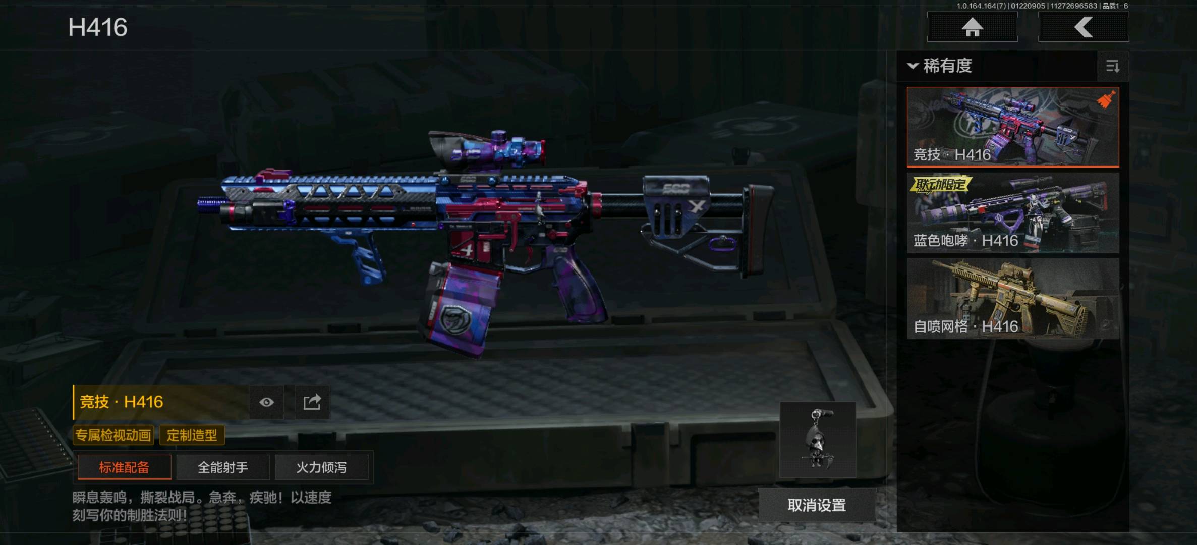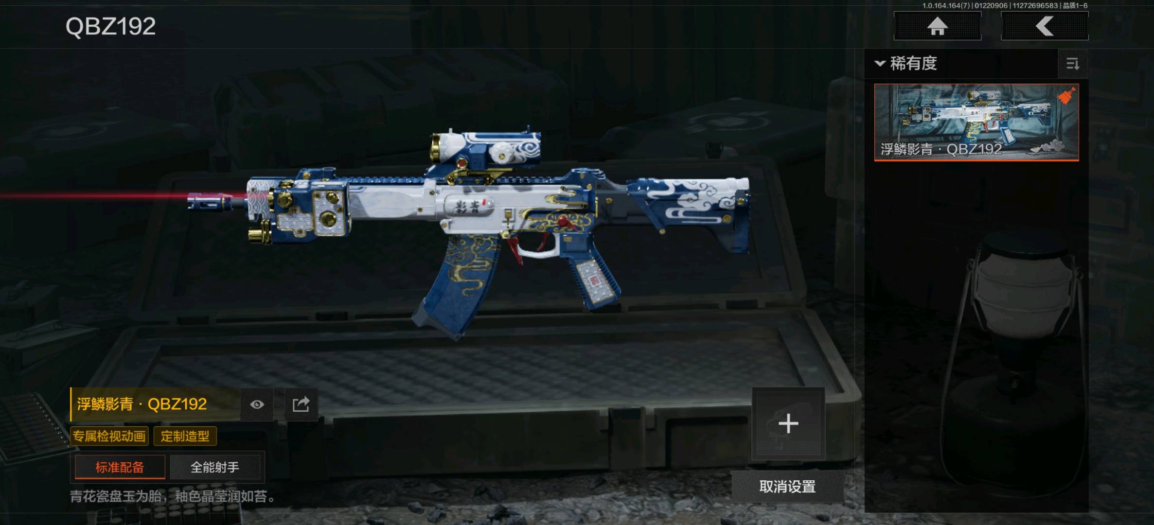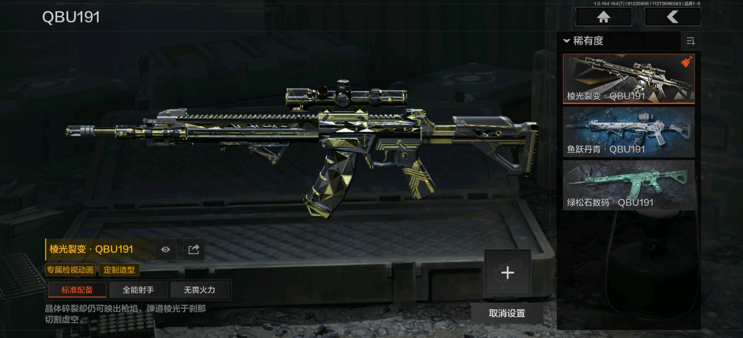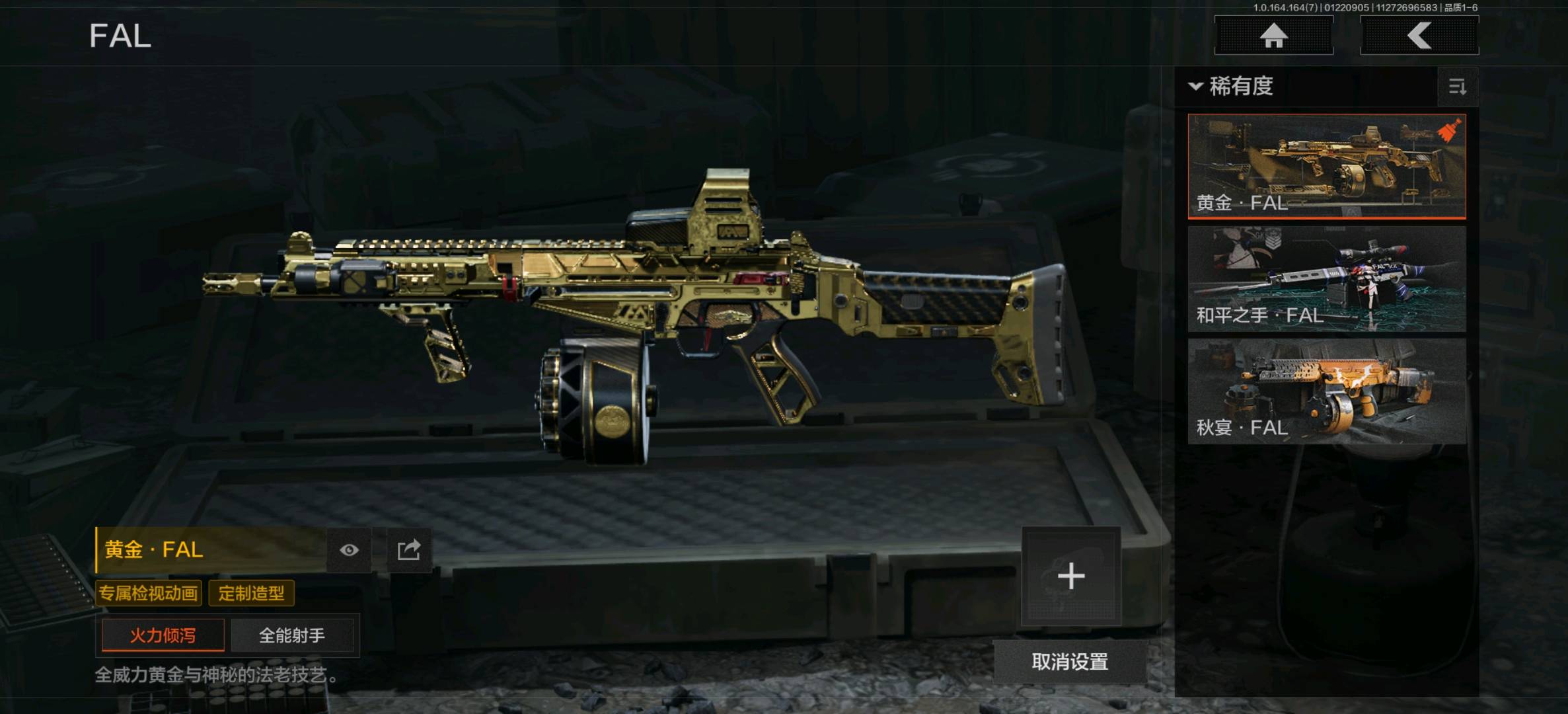 黄金FAL,包络战术AKM,竞技H416,蓝色咆哮H416,告丧夜曲AUG,战术大师AEK,旗帜AEK,战术大师AN94,旧王圣谕QBZ191,浮鳞影青QBZ192,和平之手FAL,来战AKM,潜渊蛇鳞M4A1,幻域莎绫M4A1,德尔塔小队M4A1,竞技M4A1,自喷网格H416,鱼跃丹青DTMDR,竞技MDR,鱼跃丹青AK102,涂鸦AK102,火力倾泻AUG,火绒草AUG,战术大师AK74N,棱光裂变AK74N,来战AK74N,骑士之剑AKS74U,赢家F2000,炎夏浪花AR57,棱光裂变ACE31,骑士之剑ACE31,伦琴计量AN94,典礼武备Groza,巡林客T951,骑士之剑T03,利齿风暴T03,鱼跃丹青MCX,典礼武备MCX,07式林地迷彩QBZ191;