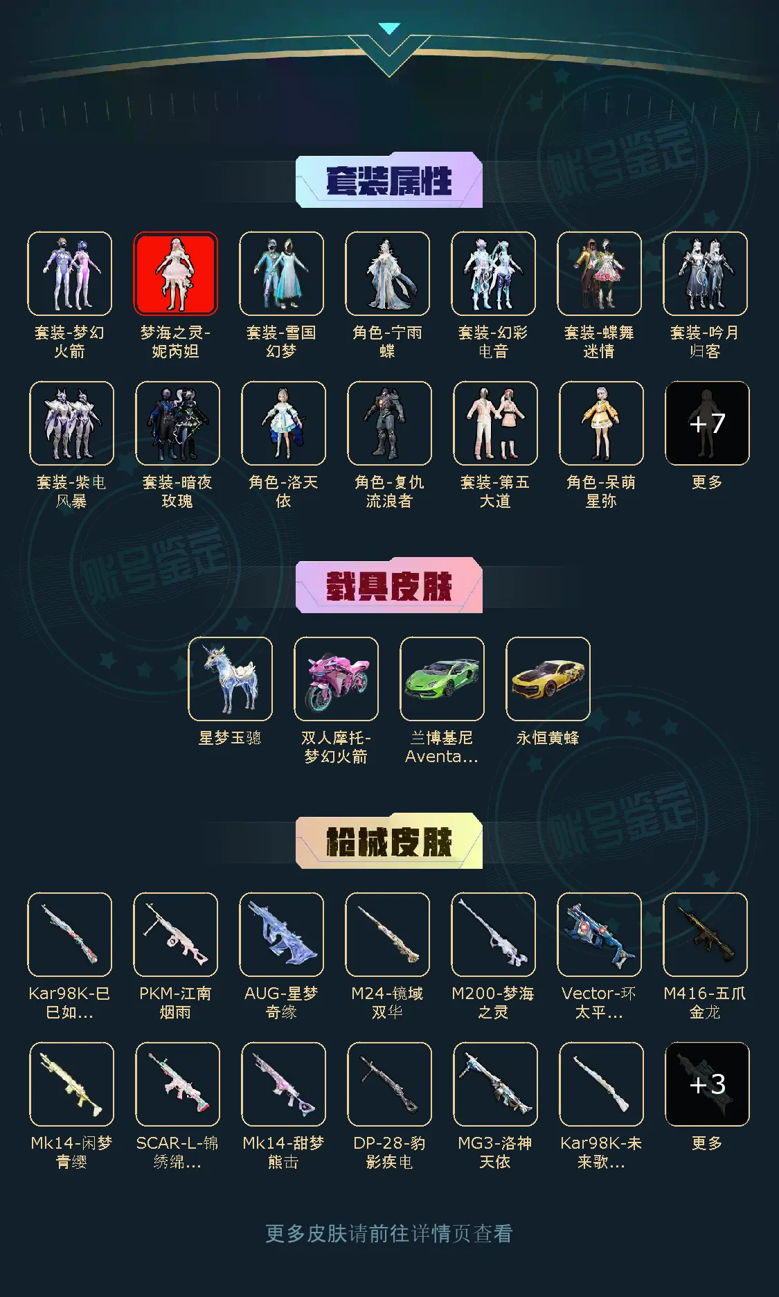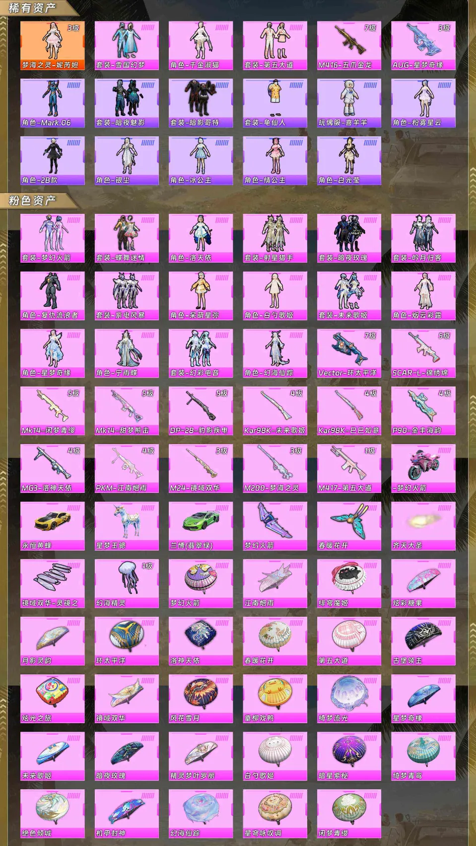 【稀有资产】梦海之灵-妮芮妲[3级]/套装-雪国幻梦/角色-千金淑猫/套装-第五大道/M416-五爪金龙/AUG-星梦奇缘/角色-Mark.06/套装-暗夜魅影/套装-暗影哥特/套装-龟仙人/玩偶服-喜羊羊/角色-粉雾星云/角色-2B战斗服款/角色-银尘/角色-冰公主/角色-情公主/角色-白光莹