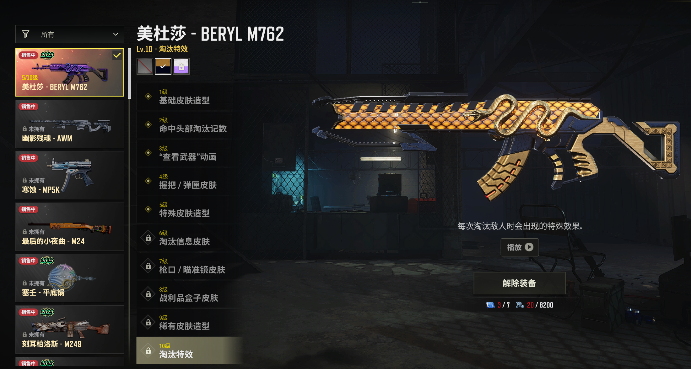 5级黑金异色美杜莎M762=粉烟=金面双马尾=新魂白运动绿东南亚=PNC2025套=拉风龙套=PGC套=白熊套=6皮M762=5皮M4=2皮AUG=2皮迷你=5皮98K=4皮SKS=3皮大炮=2皮M24=一枪多皮=小兔学院套=背包套头盔套等等