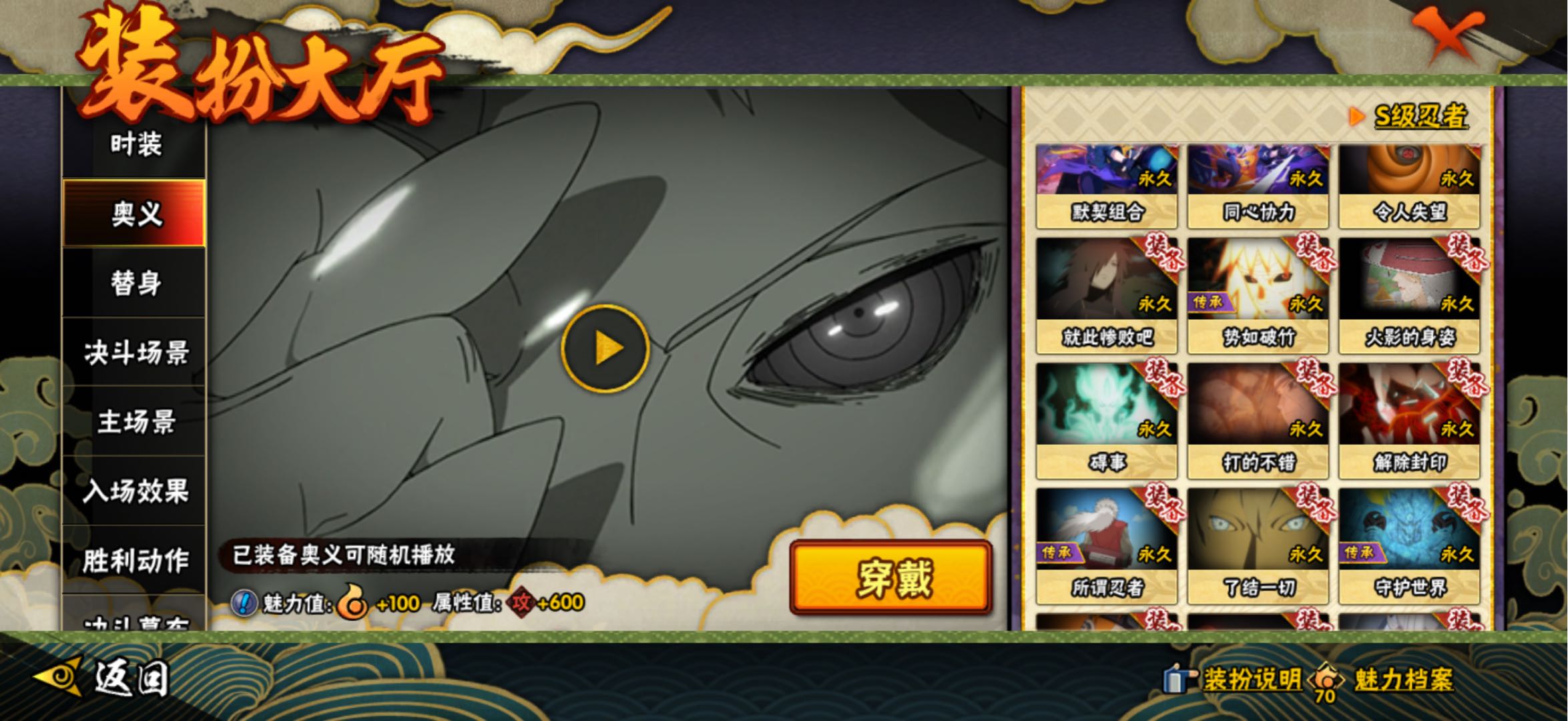 宇智波斑 「秽土转生·解」 千手柱间 「木叶创立」 宇智波佐助「永恒万花筒」 神秘面具男 「红夜之刃」春野樱 「忍界大战」大筒木金式 「博人传」漩涡鸣人「九喇嘛连结」三代目风影「秽土转生」大蛇丸「百战不灭」大野木「忍界大战」迈特凯「死门」宇智波斑「木叶创立」宇智波带土「忍界大战」千手柱间「秽土转生」罗砂「四代目风影」宇智波鼬「秽土转生」自来也「舞之豪杰」佩恩·天道「超」药师兜「仙人模式」宇智波斑「秽土转生」艾「三代目雷影」宇智波斑「白面具」半藏「秽土转生」千手扉间「秽土转生」纲手「百豪」无「二代目土影」波风水门「秽土转生」金角·银角「秽土转生」猿飞日斩「秽土转生」长门「秽土转生」宇智波斑 千手柱间 艾「四代目雷影」千手扉间 神秘面具男 鬼灯幻月「二代目水影」佩恩「天道」大蛇丸 波风水门 纲手 自来也 宇智波鼬「须佐能乎」大野木「三代目土影」自来也「仙人模式」猿飞日斩