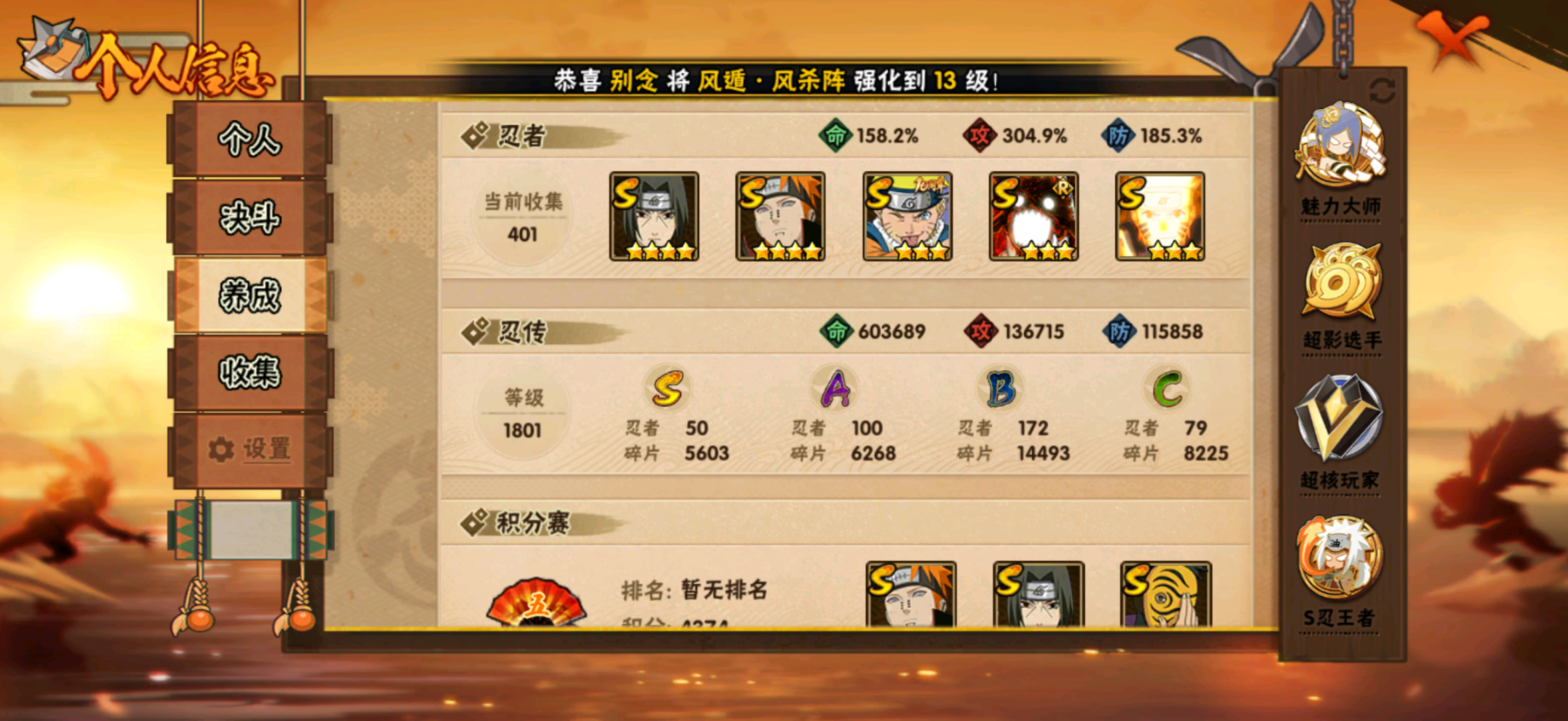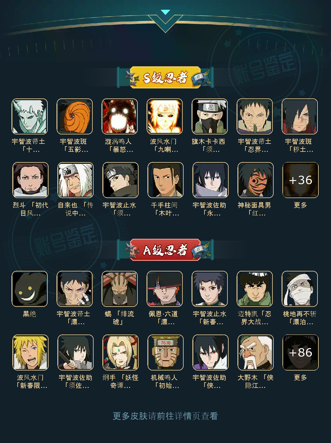 仙人自来也 纲手 波风水门 百战水门 猿飞日斩 千手柱间 宇智波斑 宇智波鼬 舞之自来也 大蛇丸 百战大蛇 秽土四代 秽土三代 秽土长门 仙人兜 黄猿九喇嘛鸣人 紫狗永恒佐助 樱婊忍战樱 秽土鼬 普通自来也 百豪纲手 死门凯 二代扉间 秽土二代 秽土初代 秽土柱间 白面具 须佐卡卡西 小胡子鬼灯幻月 雷影 土影 无 佩恩 百战佩恩 青年柱间 创立初代 秽土斑 青年斑 解斑 须佐止水 虎皮 破面带土 红夜带土 罗砂 秽土三代风影 忍战雷影 三代雷影 金角银角 秽土半藏 忍战大野木 小土豆 天道超 大筒木桃式 大筒木金式 钢铁之躯凯 桀骜之刃阿斯玛 狂野之鲨鬼鲛 飞段 黑飞段 百豪樱 忍战李 大卡卡西 五代水影照美冥 宇智波鼬 仙鸣 九尾查克拉鸣人 鹰佐 奇拉比 青年艾 半蛇兜 晓蛇 新春鼬 面麻 须佐佐助 疾风咒印佐助 忍战宁次 忍战天天 最终章雏田 幻容卡卡西 神卡 忍战卡卡西 泳装卡卡西 忍战凯 青春哥 惊门凯 爱情哥 新春止水 新春水门 青年水门 青水 新春我爱罗 泳装照美冥 侠隐照美冥 侠隐纲手 侠隐兜 漂泊再不斩 漂泊佩恩 漂泊二代 漂泊小南 漂泊佩恩 三船 青年三船 青年长门 泳装南 新春南 黑绝 新春大蛇丸 晓创生角度 晓创生蝎 晓创生飞段 泳装鼬 鲛肌融合鬼鲛 新春迪达拉 秽土迪达拉 恶灵之影飞段 暴怒带土 忍战黄土 卑留呼 桃博 黑土