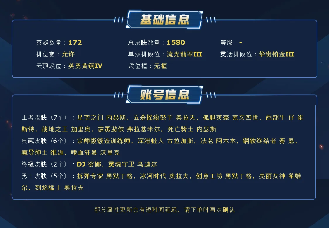 ~~喜欢记得收藏~~可排位~~1600皮全英雄~~租之前尽量查一下游戏ID,确保段位是您需要的,避免浪费您的时间~~请勿挂机逃跑故意送人头,谢谢合作,谢谢~~