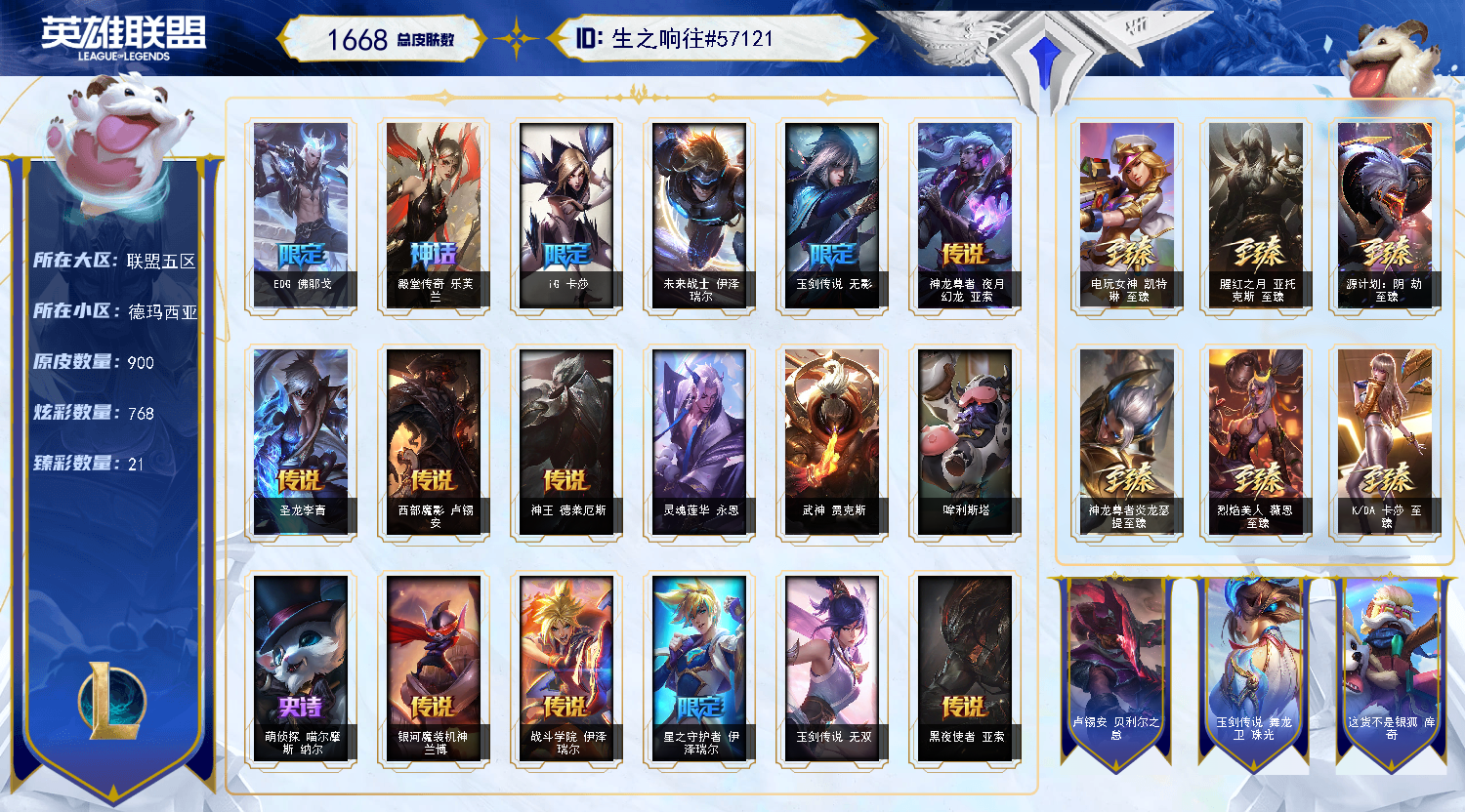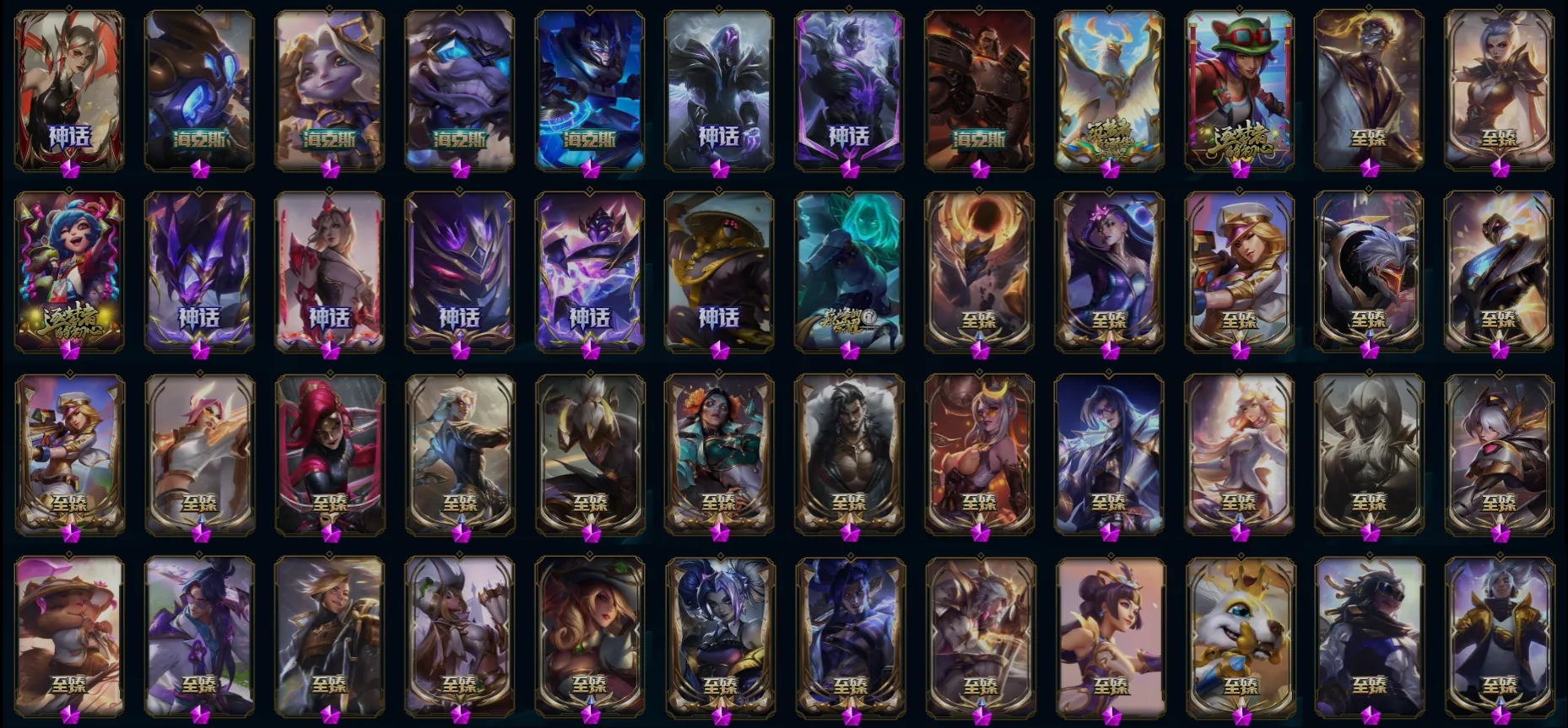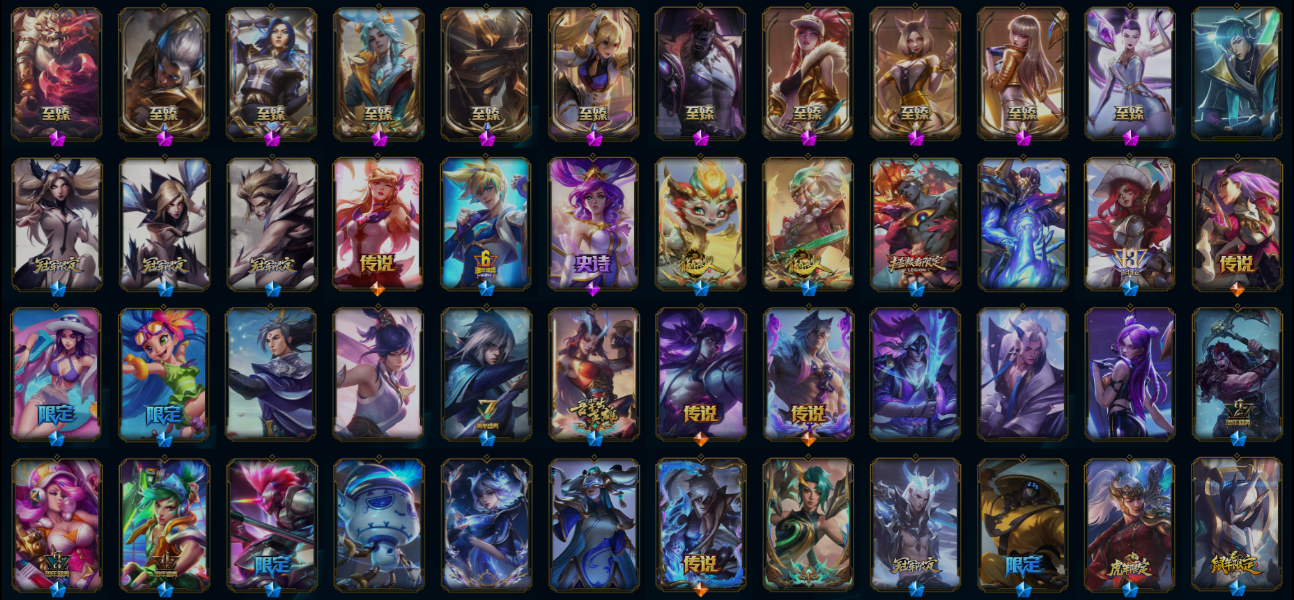 【传说皮肤】枯萎之壤泽拉斯 黎明使者锐雯 至尊魔女莫甘娜 魔女伊芙琳 心之钢凯隐 灵魂莲华锤石 西部天使赛娜 耀星女神拉克丝 女警狙击凯特琳 冰霜亚龙希瓦娜 西部魔影永恩 冰霜之刃艾瑞莉娅 神龙尊者夜月幻龙亚索 日蚀骑士希维尔 偶像歌手阿狸 光明哨兵格雷福斯 黑夜使者索拉卡 腥红之月鬼武姬阿卡丽 苹果机器人布里茨 太空律动猫猫布里和里茨 墨之影武者易 符文战熊沃利贝尔 星之守护者金克丝 星之守护者阿狸 屠龙勇士潘森 黎明使者永恩 霸天零式赛恩 红色男爵库奇 灵能特工娑娜 死亡骑士盖伦 黎明使者索拉卡 神王盖伦 灵魂莲华瑟提 源计划超体莫德凯撒 约德尔国队长提莫 驯龙学者黑默丁格 合金巨兽努努和威朗普 女皇艾希 奥德赛凯隐 电玩女神娑娜 大天使长米迦勒凯尔 女帝卡特琳娜 战斗学院伊泽瑞尔 苍穹之光韦鲁斯 绅士科加斯 真实伤害艾克 神龙尊者圣龙李青 地狱之门卫士加里奥 双重冰晶艾尼维亚 战地机甲厄加特 钢铁军团盖伦 血石领主弗拉基米尔 炼狱魔犬内瑟斯 邪鸦魅影乐芙兰 源计划净化薇恩 第三类接触黑默丁格 银河魔装机神兰博 神拳李青 丧尸布兰德 地狱行者孙悟空 上古战魂魔腾 冰川巨兽墨菲特 源计划毁灭派克 陆地王者4WD布里茨 最终BOSS维迦 魔幻卡牌崔斯特 律政大亨蒙多 黯晶凤凰艾尼维亚 战地巨兽科加斯 鬼魂新娘莫甘娜 源计划联合艾希 恶魔之刃泰达米尔 西部魔影卢锡安 铁哥们儿奥拉夫 欧米伽小队幽灵特工 烈焰雄心崔丝塔娜 提莫约德尔人的一大步 黑夜使者亚索 蔷薇绅士杰斯 灌篮高手德莱厄斯 霸天异形卡兹克 神王德莱厄斯 金牌主播德莱文 宇航员诺提勒斯 源计划林易 战场女武神凯尔 黯黑魔龙希瓦娜