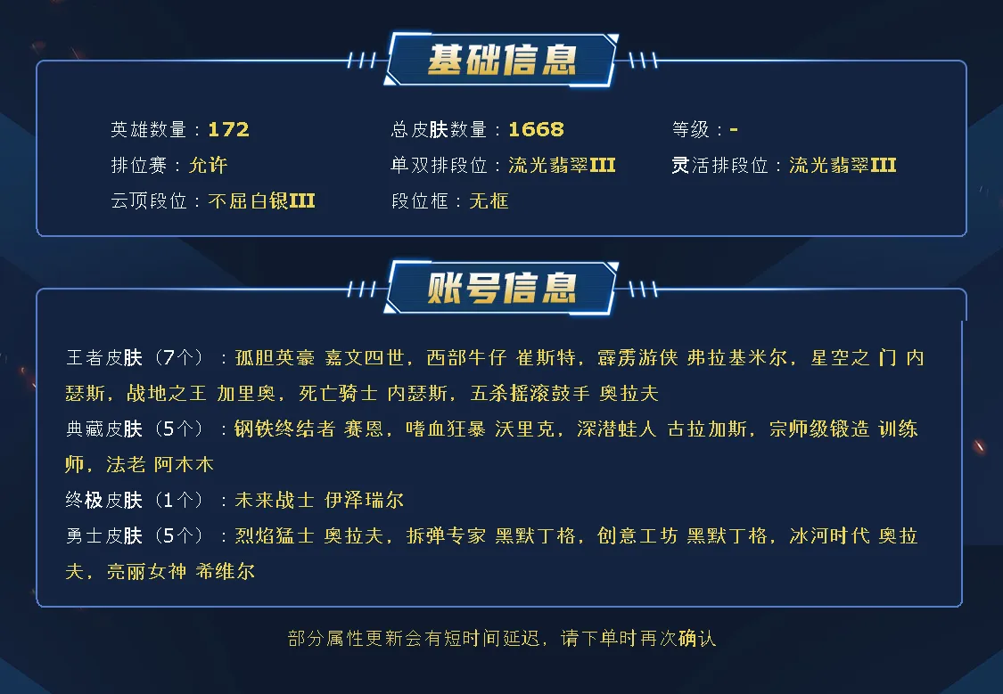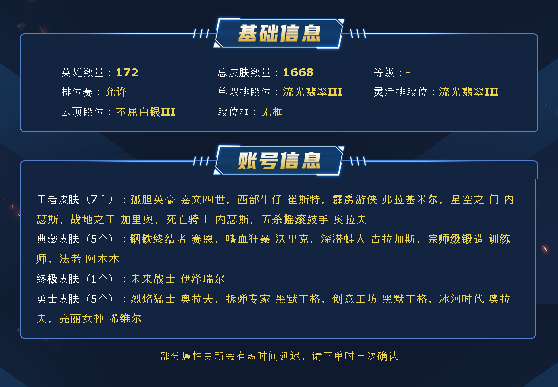 ~~喜欢记得收藏~~可排位~~1700皮全英雄~~租之前尽量查一下游戏ID,确保段位是您需要的,避免浪费您的时间~~请勿挂机逃跑故意送人头,谢谢合作,谢谢~~