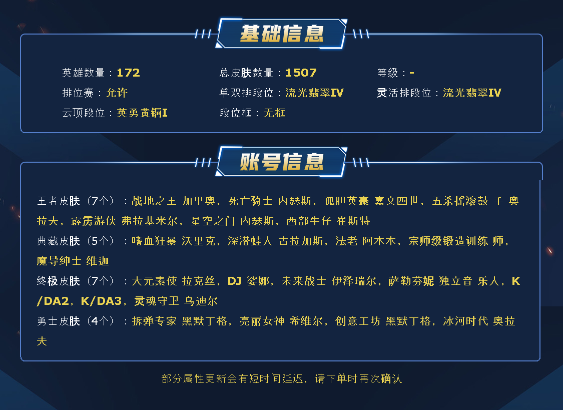 ~~喜欢记得收藏~~可排位~~1600皮全英雄~~租之前尽量查一下游戏ID,确保段位是您需要的,避免浪费您的时间~~请勿挂机逃跑故意送人头,谢谢合作,谢谢~~