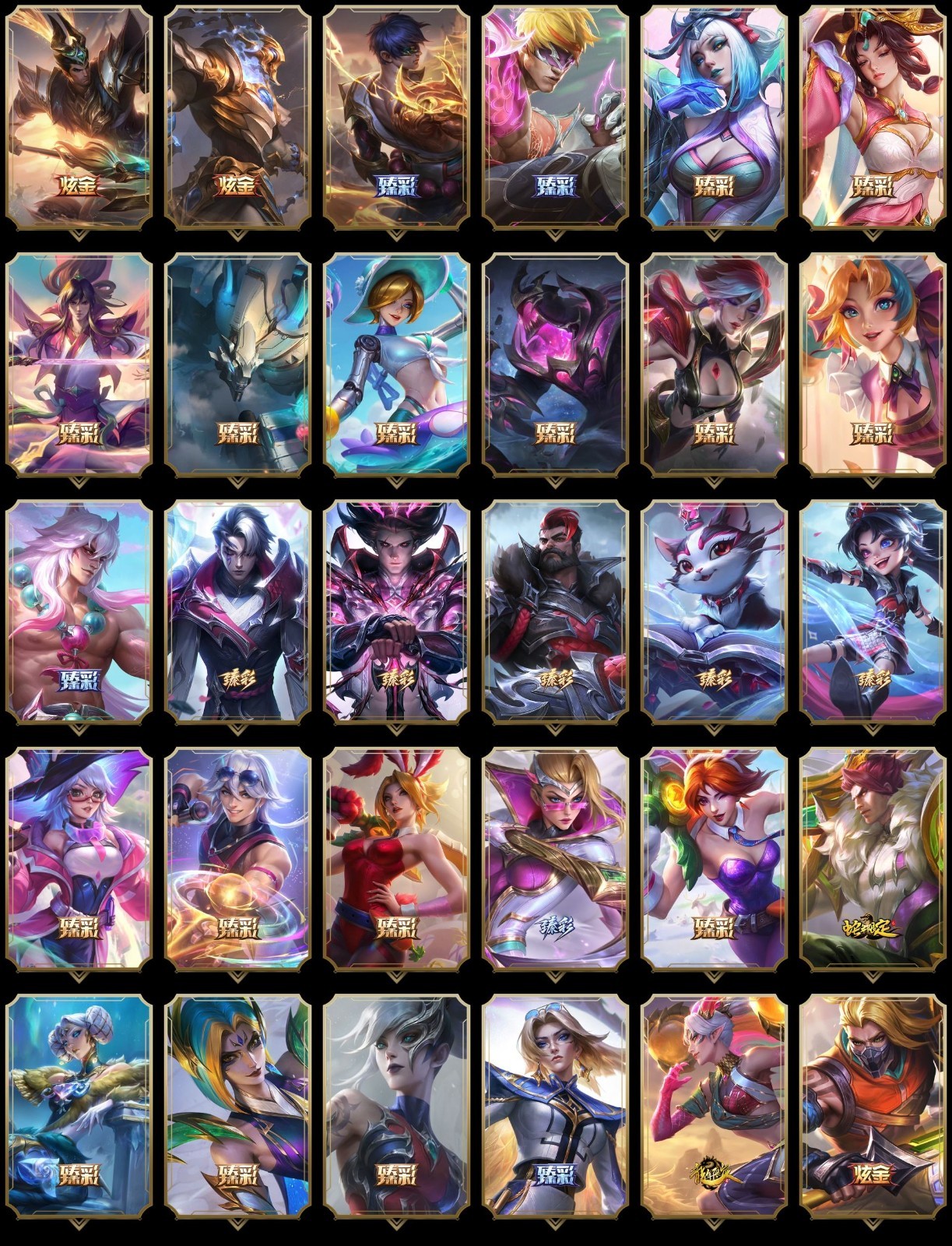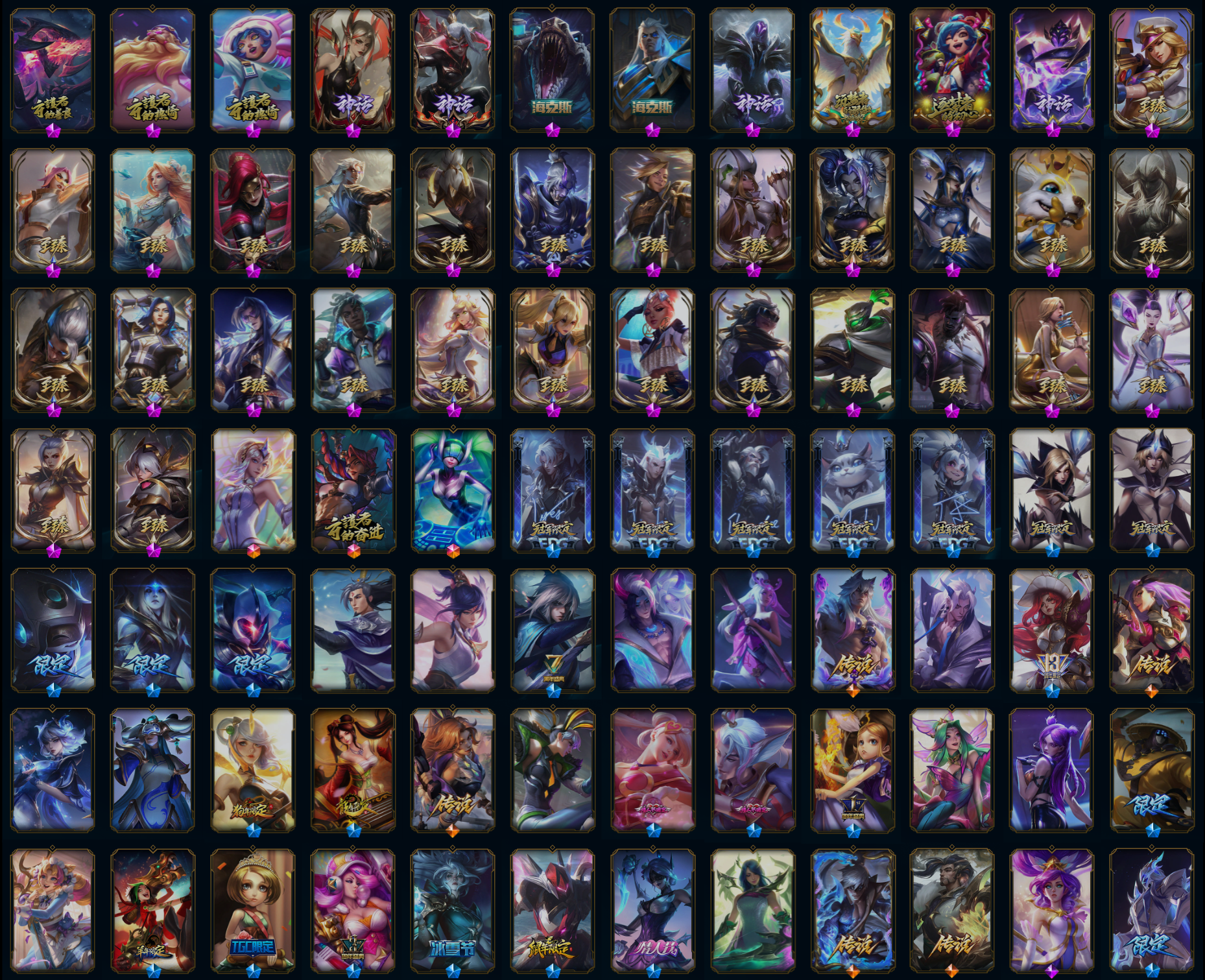【传说皮肤】未来战士凯特琳 墨之影武者易 烈焰雄心崔丝塔娜 死亡骑士盖伦 西部天使赛娜 焰尾妖狐阿狸 枯萎之壤泽拉斯 神龙尊者昼日真龙亚索 女帝卡特琳娜 约德尔国队长提莫 影执事劫 至尊魔女莫甘娜 源计划超体莫德凯撒 绝息圣堂锐雯 神王盖伦 海魔至尊亚托克斯 魔幻卡牌崔斯特 双重冰晶艾尼维亚 地狱行者孙悟空 泳池派对吉格斯 幻灵战斗队长厄运小姐 灵能特工娑娜 蔷薇绅士杰斯 暗星女王拉克丝 耀星女神拉克丝 灵魂莲华瑟提 星之守护者霞 天煞劫 腥红之月鬼武姬阿卡丽 战场女武神凯尔 星之守护者拉克丝 黎明使者锐雯 钢铁军团盖伦 血石领主弗拉基米尔 屠龙勇士潘森 炼狱魔犬内瑟斯 源计划净化薇恩 第三类接触黑默丁格 神拳李青 神龙尊者圣龙李青 银河魔装机神兰博 邪鸦魅影乐芙兰 丧尸布兰德 上古战魂魔腾 战地机甲厄加特 苹果机器人布里茨 冰川巨兽墨菲特 陆地王者4WD布里茨 女警狙击凯特琳 最终BOSS维迦 暗星锤石 红色男爵库奇 电玩女神娑娜 律政大亨蒙多 黯晶凤凰艾尼维亚 地狱之门卫士加里奥 绅士科加斯 西部魔影卢锡安 恶魔之刃泰达米尔 铁哥们儿奥拉夫 暗星尊烬 合金巨兽努努和威朗普 驯龙炮手崔丝塔娜 欧米伽小队幽灵特工 提莫约德尔人的一大步 黑夜使者亚索 奥德赛凯隐 神王德莱厄斯 恶魔男爵瑞兹 灌篮高手德莱厄斯 霸天异形卡兹克 金牌主播德莱文 源计划林易 女校长菲奥娜 宇航员诺提勒斯 符文战熊沃利贝尔 苍穹之光韦鲁斯 偶像歌手阿狸 冰霜亚龙希瓦娜 钢铁之翼凯尔 大天使长米迦勒凯尔 黯黑魔龙希瓦娜 女皇艾希 女主播迦娜