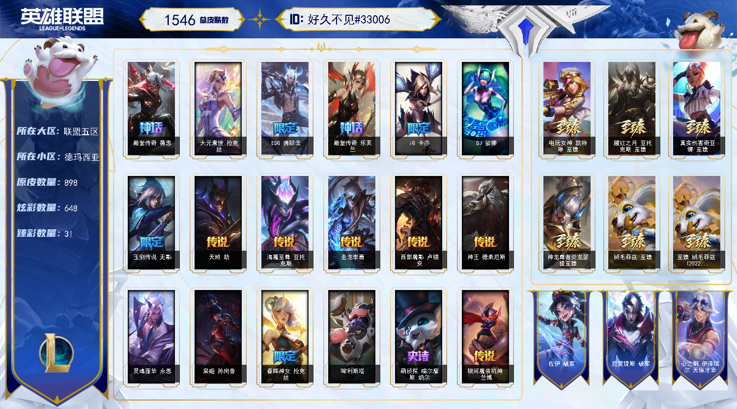【重要皮肤】灵魂莲华劫至臻 黑色玫瑰假面舞会卡特琳娜至臻 双城之战2指挥官凯特琳至臻 魔域梦魇泽丽至臻 心之钢永恩至臻 青花瓷丽桑卓至臻 至高天奎桑提至臻 星之守护者艾克至臻 海之歌萨勒芬妮至臻 战斗学院蕾欧娜至臻 真实伤害赛娜至臻 星之守护者索拉卡至臻 灵能特工伊泽瑞尔至臻 福牛守护者菲奥娜至臻 神龙尊者炎龙瑟提至臻 黑夜使者凯隐至臻 征服者贾克斯至臻 KDA二代卡莎至臻 KDA伊芙琳至臻 电玩女神凯特琳至臻 电玩女神凯特琳2022至臻 魅惑女巫厄运小姐至臻 魅惑女巫厄运小姐2022至臻 源计划正义艾瑞莉娅至臻 源计划正义艾瑞莉娅2022至臻 真实伤害奇亚娜至臻 绒毛菲兹至臻 绒毛菲兹2022至臻 玉剑传说武剑仙至臻 玉剑传说武剑仙2022至臻 腥红之月亚托克斯至臻 腥红之月亚托克斯2022至臻 黑夜使者李青至臻 黑夜使者李青2022至臻 殿堂传奇薇恩 殿堂传奇乐芙兰 超级COSPLAY粉丝妮蔻 超级音乐粉丝古拉加斯 水晶巫灵泽拉斯 灰烬骑士派克 海克斯科技安妮 海克斯科技雷克顿 海克斯科技斯维因 海克斯科技阿木木 暗星科加斯 胜利剑圣易 胜利女神娑娜 胜利巨口克格莫 舞会公主安妮 创星之灵璐璐 钢铁军团拉克丝 生化领主泰达米尔 荣誉使者玛尔扎哈 安妮梦游仙境 电玩女神厄运小姐 玉剑传说无影 女帝厄运小姐 点心宝贝阿木木 神龙烈焰金克丝 古琴余韵娑娜 春晖神女拉克丝 你看见过我的熊猫吗安妮 张辽文远 胜利女神瑟庄妮 胜利女神奥莉安娜 胜利枪神格雷福斯 胜利枪神卢锡安 幽梦玫瑰伊莉丝 甜心之翎洛 甜心宝贝娑娜 北极星神黛安娜 冰雪风暴希维尔 冬季仙境卡尔玛 冰雪女神辛德拉 魄罗骑士瑟庄妮 夺命美人卡特琳娜 平安夜女神娑娜 圣诞糖果棒厄运小姐 魅惑女巫崔丝塔娜 魅惑女巫伊莉丝 大魔法锅布里茨 海之歌奈德丽 泳池派对普朗克 泳池派对厄运小姐 泳池派对塔里克 泳池派对格雷福斯 泳池派对李青 泳池派对蕾欧娜 泳池派对雷克顿 斩星魔剑易 御星魔矢艾希 克格汪 制胜金靴李青 DRX亚托克斯 EDG厄斐琉斯 EDG佛耶戈 EDG格雷福斯 EDG悠米 EDG佐伊 DWG崔斯特 DWG奈德丽 iG卡莎 iG乐芙兰 SSG洛 SSG塔莉垭 SKTT1辛德拉 SKTT1阿利斯塔 SKTT1瑞兹 SKTT1阿兹尔 SKTT1伊莉丝 SKTT1雷克顿 SSW雷恩加尔 SSW泰隆 SSW图奇 SSW辛吉德 SKTT1贾克斯 SKTT1劫 SKTT1婕拉 SKTT1李青 SKTT1薇恩 暗杀星奥莉安娜 暗杀星蒙多 暗杀星努努和威朗普 暗杀星伊泽瑞尔 暗杀星慎 Fnatic迦娜 Fnatic库奇 Fnatic古拉加斯 Fnatic卡尔萨斯 冰雪节玛尔扎哈 冰雪节辛吉德 冰雪兽纳尔 防暴士兵辛吉德 防暴天使凯尔 钢铁之翼艾尼维亚 冠军典狱长锤石 冠军之血希瓦娜 冠军之志瑞兹 春晖大帝锤石 鬼影森森茂凯 鬼影重重魔腾 海贼瑞兹 红桃杰克崔斯特 胡桃夹子萨科 警用试作体K9内瑟斯 蓝色忧郁崔斯特 密林猎手提莫 南瓜头费德提克 女猎手希维尔 圣诞精灵崔丝塔娜 圣诞开心鬼提莫 圣诞狂欢基兰 圣诞狂欢努努和威朗普 圣诞老人古拉加斯 圣诞玩偶波比 圣诞驯鹿克格莫 外星装甲库奇 卧虎藏龙贾克斯 无头骑士赫卡里姆 喜庆之树茂凯 邪恶圣诞老人维迦 幸福女神乐芙兰 雪默丁格 雪装奈德丽 野兽猎人德莱文 野兽猎人瑟庄妮 野兽猎人泰达米尔 英勇玩具兵普朗克 勇者阿狸 勇者奈德丽 征服者卡尔玛 征服者诺提勒斯 暗影沃里克 冠军之箭艾希 机械迷城加里奥 阿木木主人不要我了 2023全球总决赛雷克顿 波比的巧克力工坊 地底世界崔斯特 都铎王朝图奇 十周年纪念安妮 源代码乐芙兰 神凰行者瑞羽圣凰艾尼维亚 胜利凤凰艾尼维亚 机神朱雀蕾欧娜 斗魂觉醒莎弥拉 暗裔英雄盖伦 DJ娑娜 大元素使拉克丝 灵魂守卫乌迪尔
