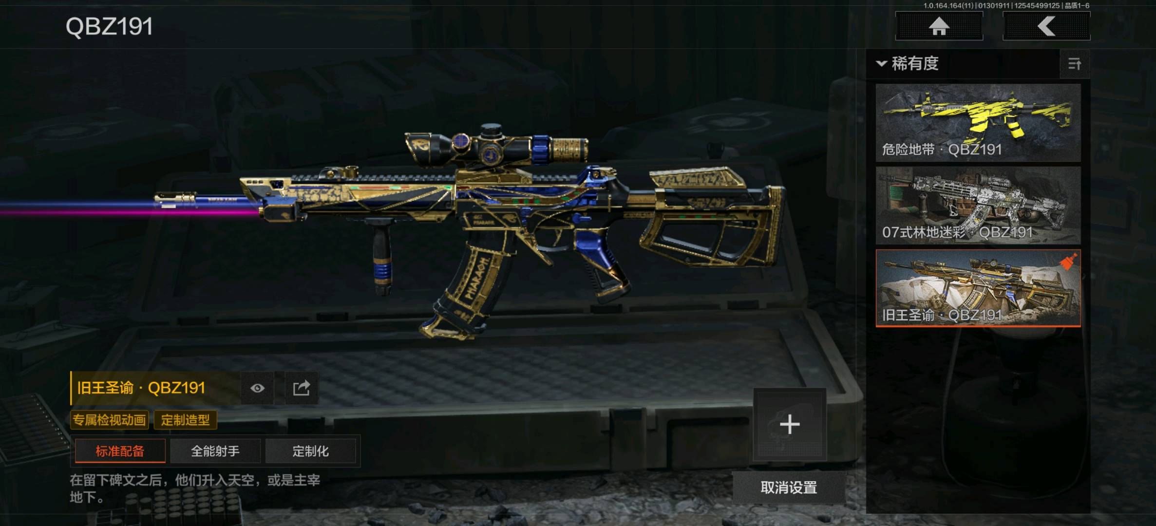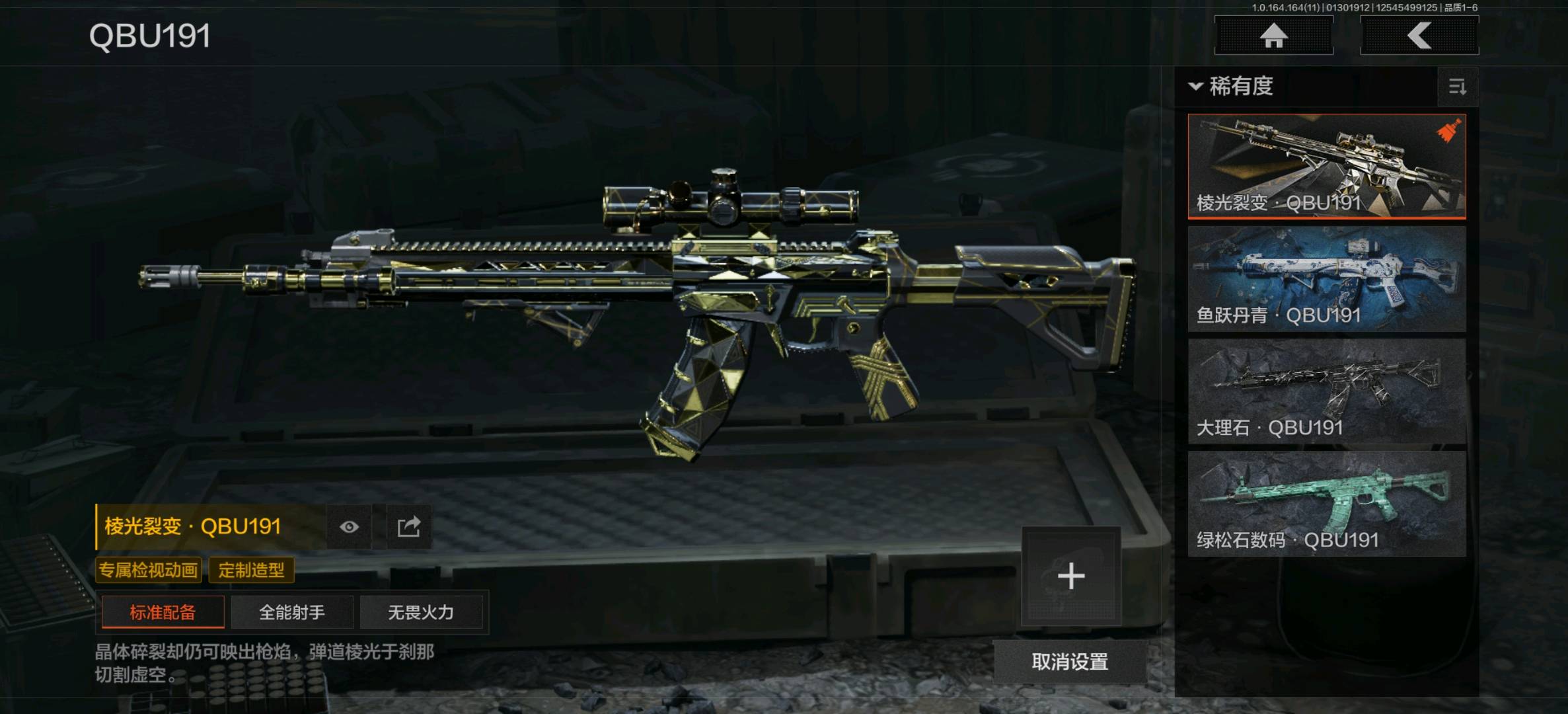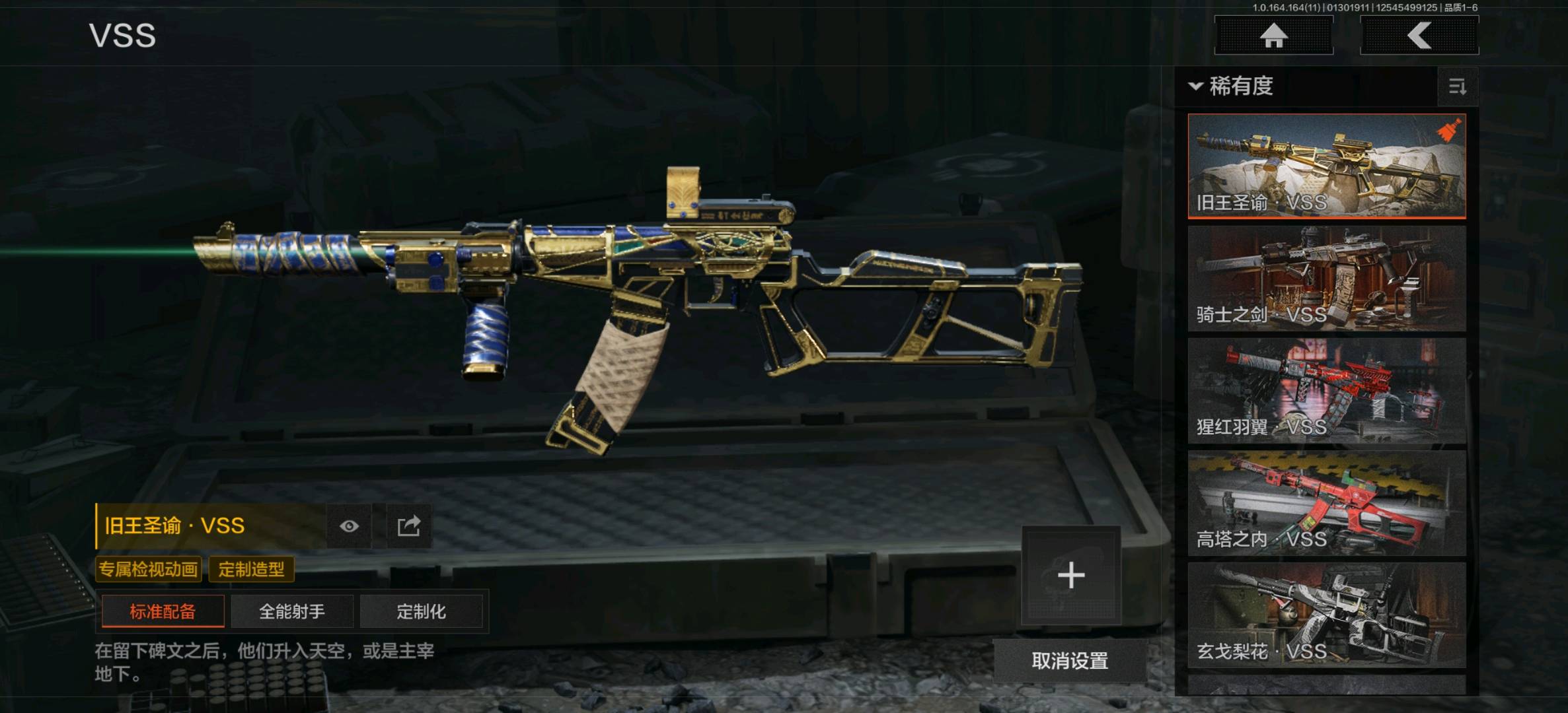 旧王圣谕VSS,骑士之剑VSS,棱光裂变QBU191,战术大师SVDS,高塔之内VSS,玄戈梨花VSS,典礼武备MK14,骑士之剑MK14,缟兵玄墨M110,鱼跃丹青QBU191;