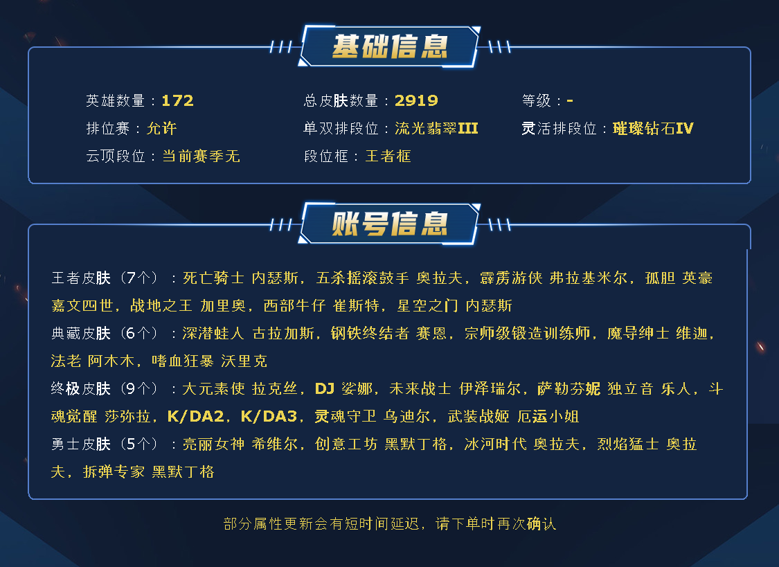 龙虾,1435皮肤 1484炫彩 39臻彩 99神话/279限定/116传说/172英雄