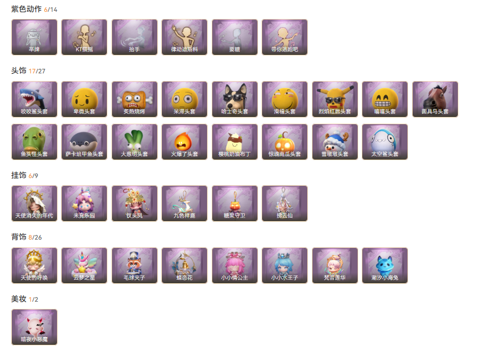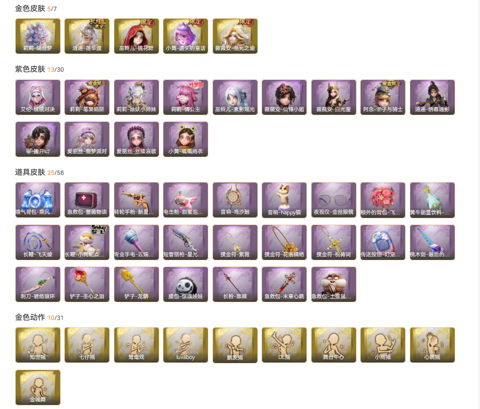 皮肤:薇薇安-圣光之谕,巫铃儿-镜花辞,逍遥-莲华渡,小黄-遗失的童话,莉莉-瑶台梦,薇薇安-白光莹,艾伦-绒绒对决,小黄-呱呱雨衣,零-搬开山,逍遥-绣春逍影,爱丽丝-丝缕哀歌,莉莉-莓果陷阱,薇薇安-仙锋小姐,爱丽丝-甜梦派对,巫铃儿-素影瑶光,莉莉-除妖小师妹,阿念-王子与骑士,莉莉-情公主;道具:铲子-龙鳞,音响-happy猫,转轮手枪-新星时代,短管猎枪-星光的裁决,铲子-圣心之泪,电击枪-甜蜜泡泡枪,喷气背包-乘风溯雪,额外的背包-飞花令,刺刀-碧络琅环,长鞭-小狗蛇点点鞭,黄牛能量饮料-青玉抱丹,专业手电-云端梦想计划,摸金符-花落精绝,音响-鸣沙鼓,传送按钮-幻宠之门,急救包-蔷薇物语,摸金符-祝祷词,长枪-罪棘,摸金符-紫霄,急救包-末章心跳,桃木剑-最后的独角兽,腰包-惊魂娃娃,夜视仪-金丝眼镜,长鞭-飞天绫,急救包-土拨鼠捏捏;美妆:美妆-暗夜小恶魔;饰品:头饰-嘻嘻头套,头饰-滑稽头套,头饰-大葱明头套,头饰-面具马头套,头饰-哈士奇头套,头饰-樱桃奶油布丁,头饰-萨卡班甲鱼头套,头饰-卑微头套,头饰-雪墩墩头套,头饰-太空鲨头套,头饰-烈焰红唇头套,头饰-惊魂南瓜头套,头饰-火爆了头套,头饰-鱼头怪头套,头饰-咬咬鲨头套,头饰-炙热烧烤,头饰-呆滞头套,头饰-像素朋克墨镜,头饰-后室幸存者头套,挂饰-未竟乐园,挂饰-天使消失的年代,挂饰-钗头凤,挂饰-拂云仙,挂饰-糖果守卫,挂饰-九色祥鹿,背饰-梵音莲华,背饰-潮汐小海兔,背饰-小小水王子,背饰-小小情公主,背饰-天使的呼唤,背饰-毛球夹子,背饰-蝶恋花,背饰-云梦之星;动作:动作-KT猫摇,动作-DL摇,动作-七仔摇,动作-舞台中心,动作-鸳鸯戏,动作-鹏友摇,动作-知世摇,动作-小雨摇,动作-金城舞,动作-心跳摇,动作-luvaboy,动作-举牌,动作-律动迪斯科,动作-带你逃跑吧,动作-要糖,动作-抬手;工牌背景:工牌背景-卷珠帘,工牌背景-复活的肖像,工牌背景-点点萌伴,工牌背景-心同野鹤,工牌背景-雷霆轩,工牌背景-情语塔,工牌背景-童话扉页,工牌背景-圣光之誓;工牌动作:工牌动作-轻躯鹤立,工牌动作-元气剪刀手,工牌动作-虔诚之姿,工牌动作-净禅;员工:小黄,小满,薇薇安,逍遥,爱丽丝,巫铃儿,爱德华,莉莉,零,阿念,兰,艾伦