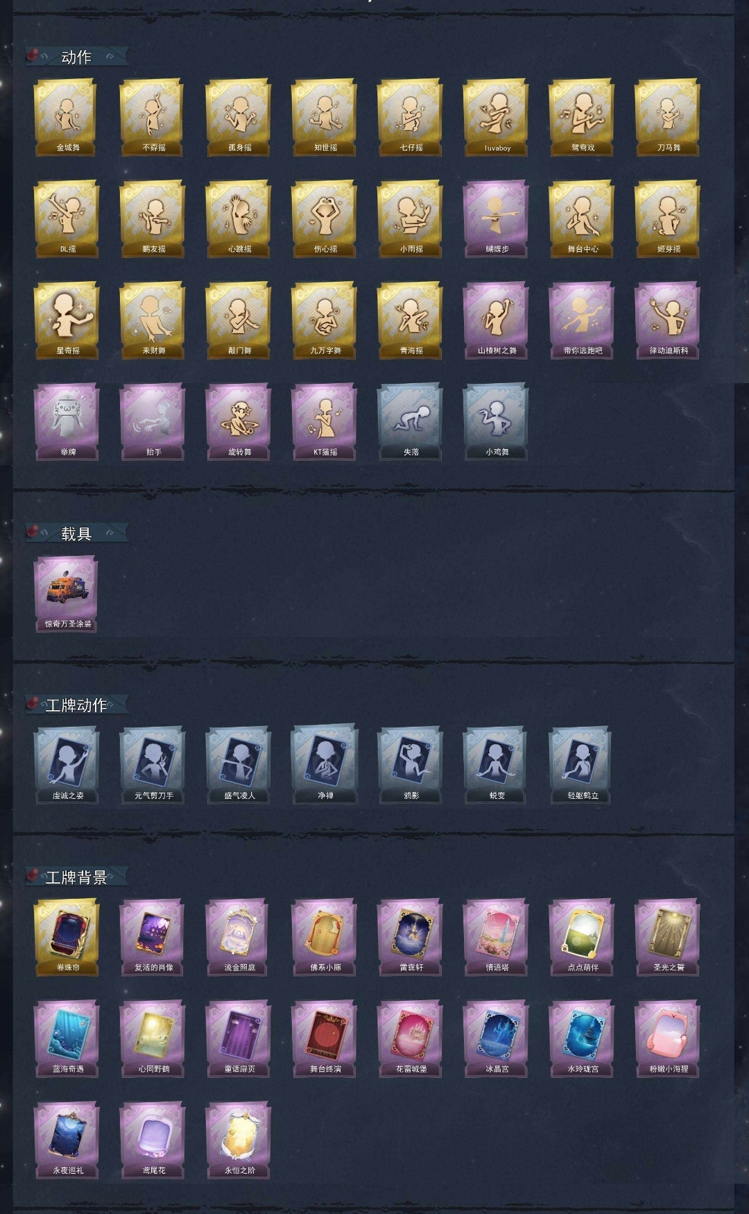【动作】金城舞、不孬摇、孤身摇、知世摇、七仔摇、luvaboy、鸳鸯戏、刀马舞、DL摇、鹏友摇、心跳摇、伤心摇、小雨摇、蝴蝶步、舞台中心、姬芽摇、星奇摇、来财舞、敲门舞、九万字舞、青海摇、山楂树之舞、带你逃跑吧、律动迪斯科、举牌、抬手、旋转舞、KT猫摇、失落、小鸡舞