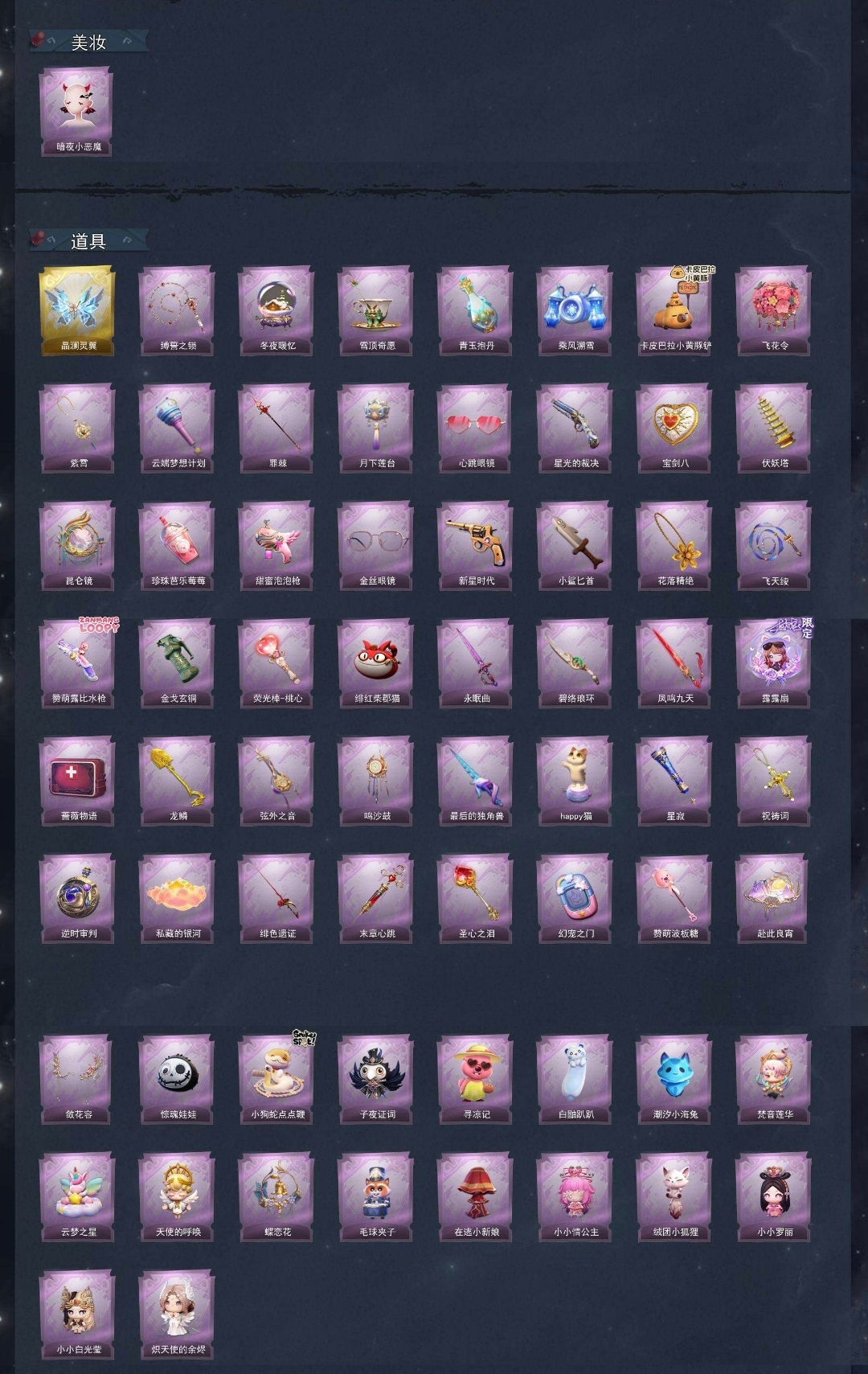 【道具皮肤】喷气背包-晶澜灵翼、长鞭-缚誓之锁、音响-冬夜暖忆、黄牛能量饮料-雪顶奇愿、黄牛能量饮料-青玉抱丹、喷气背包-乘风溯雪、铲子-卡皮巴拉小黄豚铲、额外的背包-飞花令、摸金符-紫霄、专业手电-云端梦想计划、腰包-月下莲台、夜视仪-心跳眼镜、短管猎枪-星光的裁决、腰包-宝剑八、葫芦-伏妖塔、传送按钮-昆仑镜、黄牛能量饮料-珍珠芭乐莓莓、电击枪-甜蜜泡泡枪、夜视仪-金丝眼镜、转轮手枪-新星时代、刺刀-小鲨匕首、摸金符-花落精绝、长鞭-飞天绫、短管猎枪-赞萌露比水枪、闪光弹-金戈玄铜、腰包-绯红柴郡猫、桃木剑-永眠曲、刺刀-碧络琅环、桃木剑-凤鸣九天、折扇-露露扇、急救包-蔷薇物语、铲子-龙鳞、除颤仪-弦外之音、音响-鸣沙鼓、桃木剑-最后的独角兽、音响-happy猫、专业手电-星寂、摸金符-祝祷词、传送按钮-逆时审判、腰包-私藏的银河、桃木剑-绯色遗证、急救包-末章心跳、铲子-圣心之泪、传送按钮-幻宠之门、铲子-赞萌波板糖、折扇-赴此良宵、夜视仪-花容、腰包-惊魂娃娃、长鞭-小狗蛇点点鞭、背饰-子夜证词、背饰-寻凉记、背饰-白鼬趴趴、背饰-潮汐小海兔、背饰-梵音莲华、背饰-云梦之星、背饰-天使的呼唤、背饰-蝶恋花、背饰-毛球夹子、背饰-在逃小新娘、背饰-炽天使的余烬