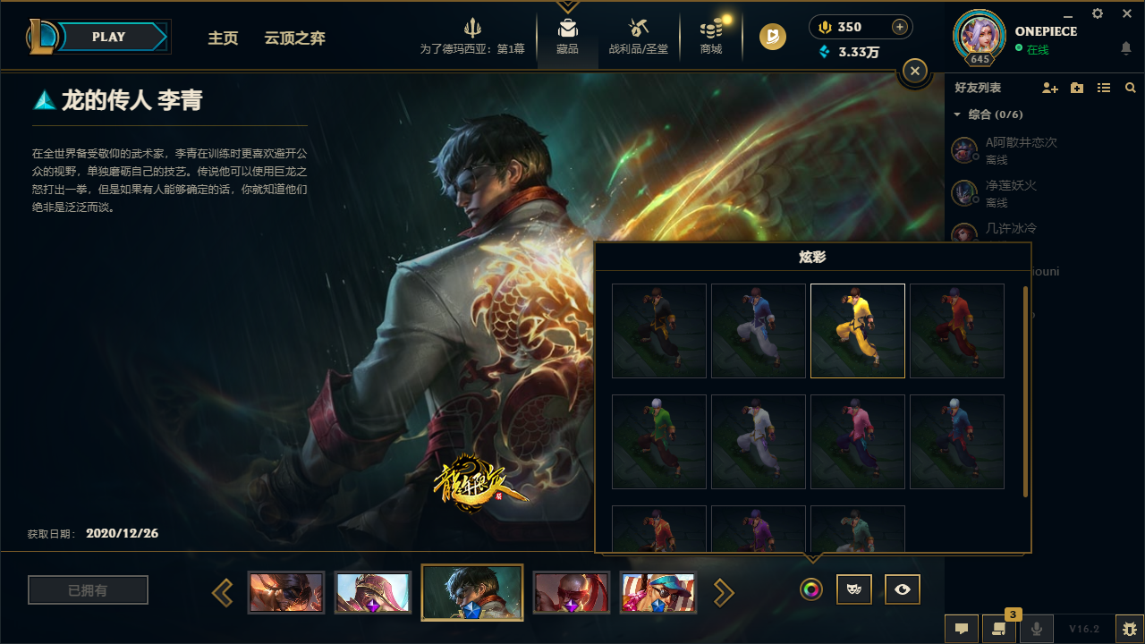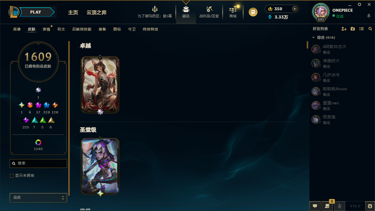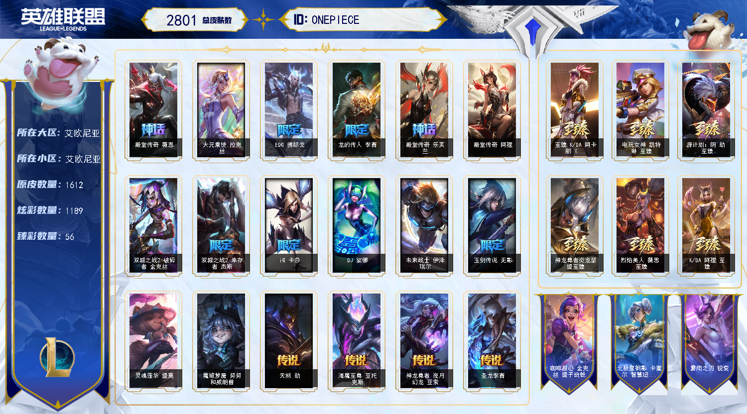 艾欧尼亚2700皮丨1609原皮丨1140炫彩丨圣堂金克斯丨328限定丨57神话丨56臻彩