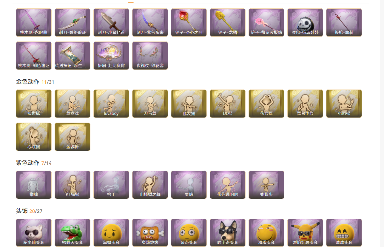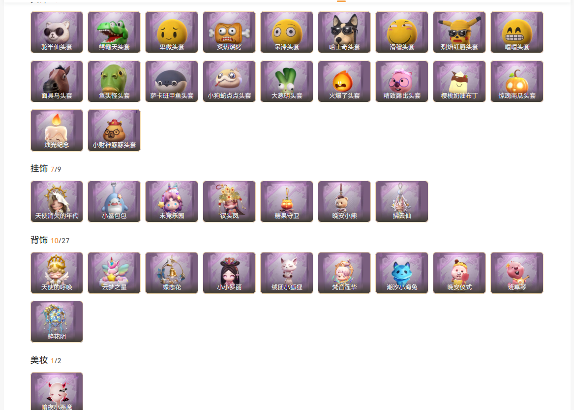 -皮肤:巫铃儿-镜生遗梦,巫铃儿-镜花辞,薇薇安-圣光之谕,小黄-遗失的童话,莉莉-瑶台梦,爱丽丝-冰公主,薇薇安-黑月挽歌,阿念-迷途僵宝,逍遥-绣春逍影,莉莉-情公主,艾伦-水王子,艾伦-绒绒对决,艾伦-黎明猎手,莉莉-莓果陷阱,莉莉-除妖小师妹,薇薇安-仙锋小姐,爱丽丝-丝缕哀歌,小黄-呱呱雨衣,薇薇安-白光莹;道具:短管猎枪-赞萌露比水枪,桃木剑-永眠曲,夜视仪-花容,铲子-龙鳞,喷气背包-乘风溯雪,摸金符-花落精绝,长鞭-小狗蛇点点鞭,桃木剑-凤鸣九天,传送按钮-浮生一梦,闪光弹-金戈玄铜,铲子-圣心之泪,腰包-惊魂娃娃,腰包-宝剑八,刺刀-小鲨匕首,额外的背包-飞花令,铲子-赞萌波板糖,音响-happy猫,黄牛能量饮料-青玉抱丹,黄牛能量饮料-珍珠芭乐莓莓,电击枪-甜蜜泡泡枪,转轮手枪-新星时代,传送按钮-昆仑镜,音响-鸣沙鼓,桃木剑-绯色遗证,长枪-罪棘,腰包-月下莲台,刺刀-紫气东来,刺刀-碧络琅环,折扇-赴此良宵,葫芦-伏妖塔,急救包-蔷薇物语,夜视仪-金丝眼镜;美妆:美妆-暗夜小恶魔;饰品:头饰-大葱明头套,头饰-烛光纪念,头饰-嘻嘻头套,头饰-炙热烧烤,头饰-精致露比头套,头饰-鳄霸天头套,头饰-哈士奇头套,头饰-惊魂南瓜头套,头饰-火爆了头套,头饰-卑微头套,头饰-鱼头怪头套,头饰-萨卡班甲鱼头套,头饰-小财神豚豚头套,头饰-小狗蛇点点头套,头饰-滑稽头套,头饰-樱桃奶油布丁,头饰-呆滞头套,头饰-驼半仙头套,头饰-烈焰红唇头套,头饰-面具马头套,头饰-像素朋克墨镜,头饰-后室幸存者头套,挂饰-糖果守卫,挂饰-晚安小熊,挂饰-天使消失的年代,挂饰-小鲨包包,挂饰-未竟乐园,挂饰-钗头凤,挂饰-拂云仙,背饰-绒团小狐狸,背饰-潮汐小海兔,背饰-蝶恋花,背饰-班卓琴,背饰-云梦之星,背饰-醉花阴,背饰-晚安仪式,背饰-小小罗丽,背饰-天使的呼唤,背饰-梵音莲华;动作:动作-鸳鸯戏,动作-心跳摇,动作-DL摇,动作-舞台中心,动作-伤心摇,动作-小雨摇,动作-luvaboy,动作-金城舞,动作-KT猫摇,动作-刀马舞,动作-知世摇,动作-鹏友摇,动作-带你逃跑吧,动作-山楂树之舞,动作-抬手,动作-举牌,动作-蝴蝶步,动作-要糖;工牌背景:工牌背景-卷珠帘,工牌背景-冰晶宫,工牌背景-雷霆轩,工牌背景-花蕾城堡,工牌背景-复活的肖像,工牌背景-圣光之誓,工牌背景-佛系小豚,工牌背景-永夜巡礼,工牌背景-情语塔,工牌背景-童话扉页,工牌背景-流金照庭,工牌背景-点点萌伴,工牌背景-蓝海奇遇;工牌动作:工牌动作-轻躯鹤立,工牌动作-虔诚之姿,工牌动作-净禅;员工:薇薇安,阿念,莉莉,爱德华,小黄,逍遥,艾伦,巫铃儿,零,小满,兰,爱丽丝;