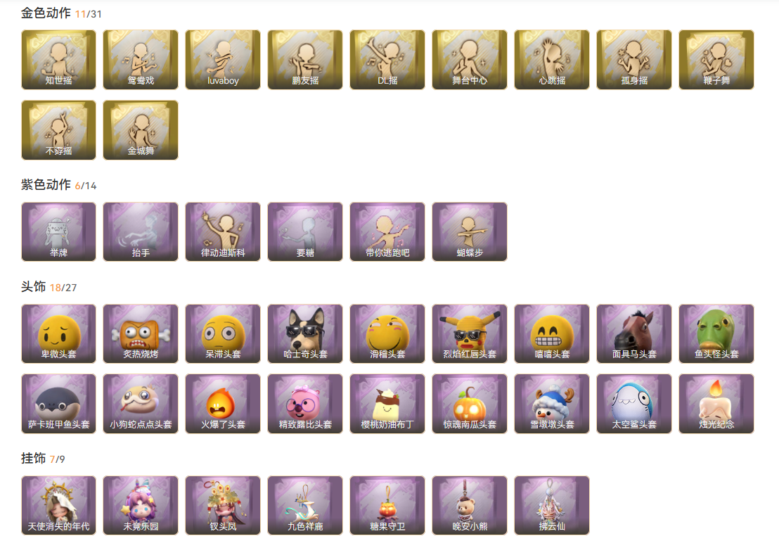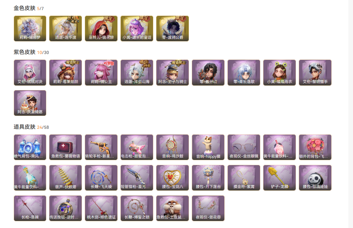 皮肤:逍遥-莲华渡,巫铃儿-镜花辞,小黄-遗失的童话,零-渡鸦公爵,莉莉-瑶台梦,莉莉-莓果陷阱,零-搬开山,阿念-庆宴绮愿,艾伦-绒绒对决,莉莉-情公主,小黄-呱呱雨衣,零-青云逸歌,艾伦-黎明猎手,逍遥-泽引山海,阿念-王子与骑士;道具:葫芦-伏妖塔,音响-happy猫,闪光弹-金戈玄铜,长鞭-缚誓之锁,摸金符-紫霄,铲子-龙鳞,转轮手枪-新星时代,黄牛能量饮料-珍珠芭乐莓莓,桃木剑-绯色遗证,喷气背包-乘风溯雪,腰包-月下莲台,夜视仪-花容,夜视仪-金丝眼镜,急救包-蔷薇物语,音响-鸣沙鼓,短管猎枪-星光的裁决,额外的背包-飞花令,腰包-惊魂娃娃,黄牛能量饮料-青玉抱丹,腰包-宝剑八,传送按钮-逆时审判,长鞭-飞天绫,电击枪-甜蜜泡泡枪,长枪-罪棘,急救包-土拨鼠捏捏;美妆:美妆-暗夜小恶魔;饰品:头饰-滑稽头套,头饰-萨卡班甲鱼头套,头饰-哈士奇头套,头饰-精致露比头套,头饰-卑微头套,头饰-烛光纪念,头饰-樱桃奶油布丁,头饰-嘻嘻头套,头饰-雪墩墩头套,头饰-惊魂南瓜头套,头饰-烈焰红唇头套,头饰-太空鲨头套,头饰-火爆了头套,头饰-炙热烧烤,头饰-蒜了八,头饰-面具马头套,头饰-呆滞头套,头饰-鱼头怪头套,头饰-小狗蛇点点头套,头饰-像素朋克墨镜,头饰-后室幸存者头套,挂饰-未竟乐园,挂饰-尘封旧事,挂饰-拂云仙,挂饰-糖果守卫,挂饰-天使消失的年代,挂饰-钗头凤,挂饰-晚安小熊,挂饰-九色祥鹿,背饰-兜风日程,背饰-梵音莲华,背饰-潮汐小海兔,背饰-天使的呼唤,背饰-醉花阴,背饰-子夜证词,背饰-白鼬趴趴;动作:动作-鞭子舞,动作-孤身摇,动作-金城舞,动作-鹏友摇,动作-舞台中心,动作-luvaboy,动作-不孬摇,动作-DL摇,动作-知世摇,动作-鸳鸯戏,动作-心跳摇,动作-律动迪斯科,动作-抬手,动作-带你逃跑吧,动作-蝴蝶步,动作-要糖,动作-举牌;工牌背景:工牌背景-卷珠帘,工牌背景-永恒之阶,工牌背景-圣光之誓,工牌背景-粉嫩小海狸,工牌背景-佛系小豚,工牌背景-童话扉页,工牌背景-花蕾城堡,工牌背景-永夜巡礼,工牌背景-复活的肖像,工牌背景-蓝海奇遇,工牌背景-流金照庭,工牌背景-心同野鹤,工牌背景-点点萌伴;工牌动作:工牌动作-鸦影,工牌动作-净禅,工牌动作-轻躯鹤立,工牌动作-蜕变;员工:兰,阿念,小满,爱德华,零,艾伦,小黄,薇薇安,莉莉,爱丽丝,逍遥,巫铃儿