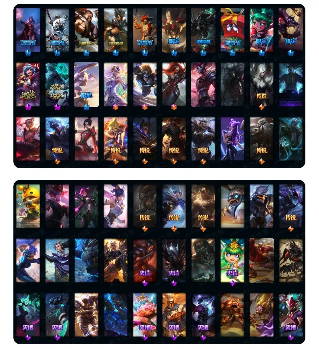 【传说皮肤】双重冰晶艾尼维亚 至尊魔女莫甘娜 蔷薇绅士杰斯 星之守护者霞 战斗学院伊泽瑞尔 女皇艾希 冰川巨兽墨菲特 恶魔男爵瑞兹 神拳李青 神王盖伦 神王德莱厄斯 源计划林易 丧尸布兰德 源计划净化薇恩 绅士科加斯 约德尔国队长提莫 西部魔影卢锡安 真实伤害艾克 邪鸦魅影乐芙兰 战地机甲厄加特 苍穹之光韦鲁斯 大天使长米迦勒凯尔 合金巨兽努努和威朗普 黎明使者锐雯 宇航员诺提勒斯 天煞劫 枯萎之壤泽拉斯 焰尾妖狐阿狸 符文战熊沃利贝尔 泳池派对吉格斯 灌篮高手德莱厄斯 电玩女神娑娜 欧米伽小队幽灵特工 炼狱魔犬内瑟斯 地狱之门卫士加里奥 黯黑魔龙希瓦娜 第三类接触黑默丁格 黑夜使者亚索 最终BOSS维迦 陆地王者4WD布里茨 女警狙击凯特琳 冰霜之刃艾瑞莉娅