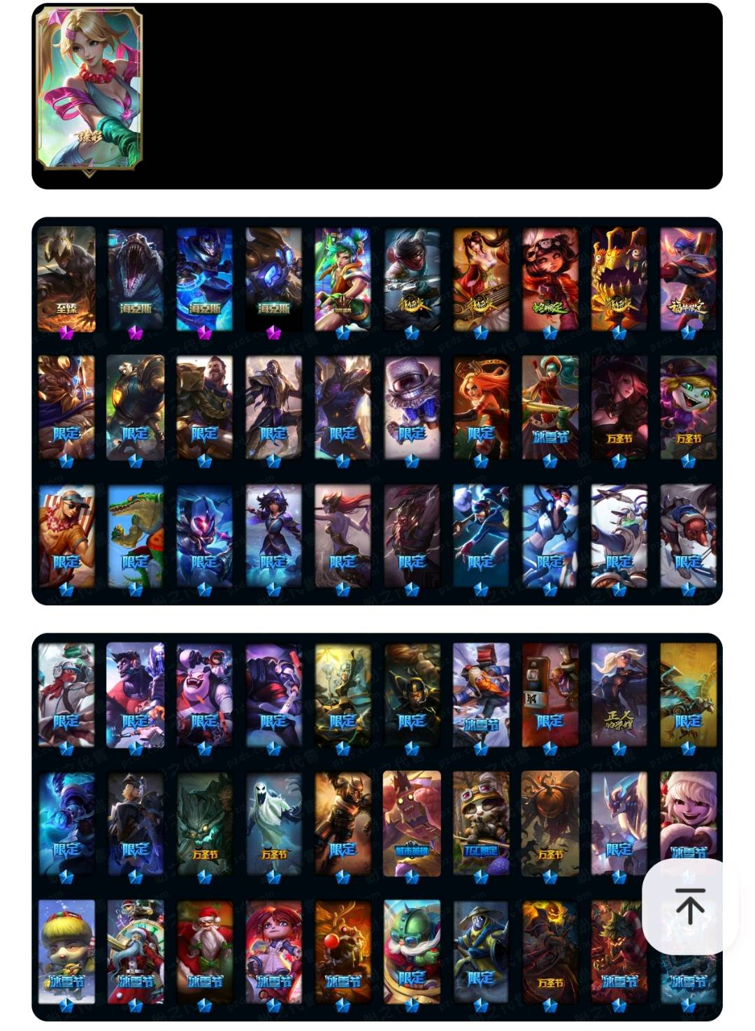 【重要皮肤】黑夜使者李青至臻 海克斯科技雷克顿 海克斯科技嘉文四世 海克斯科技阿木木 电玩勇者锐雯 银龙裁决泰隆 古琴余韵娑娜 你看见过我的熊猫吗安妮 醒狮克格莫 福牛守护者厄斐琉斯 胜利之树茂凯 胜利机器人布里茨 胜利枪神格雷福斯 胜利枪神卢锡安 胜利之剑亚托克斯 雪球也能爆炸吉格斯 夺命美人卡特琳娜 平安夜女神娑娜 魅惑女巫莫甘娜 魅惑女巫崔丝塔娜 泳池派对李青 泳池派对雷克顿 斩星魔剑易 SSG塔莉垭 SKTT1娜美 SKTT1奥拉夫 SKTT1卡莉丝塔 SKTT1伊莉丝 SSW锤石 SSW图奇 SSW辛吉德 暗杀星蒙多 暗杀星努努和威朗普 暗杀星慎 Fnatic迦娜 Fnatic嘉文四世 冰雪节辛吉德 防暴士兵辛吉德 防暴天使凯尔 钢铁之翼艾尼维亚 冠军典狱长锤石 冠军之血希瓦娜 鬼影森森茂凯 鬼影重重魔腾 警用试作体K9内瑟斯 蒙多蒙多 密林猎手提莫 南瓜头费德提克 破空枪骑孙悟空 圣诞精灵崔丝塔娜 圣诞开心鬼提莫 圣诞狂欢基兰 圣诞老人古拉加斯 圣诞玩偶波比 圣诞驯鹿克格莫 外星装甲库奇 卧虎藏龙贾克斯 无头骑士赫卡里姆 喜庆之树茂凯 邪恶圣诞老人维迦 幸福女神乐芙兰 雪默丁格 野兽猎人德莱文 野兽猎人瑟庄妮 英勇玩具兵普朗克 征服者阿利斯塔 暗影沃里克 阿木木主人不要我了 波比的巧克力工坊 都铎王朝图奇 十周年纪念安妮 源代码乐芙兰 胜利凤凰艾尼维亚 大元素使拉克丝 未来战士伊泽瑞尔 武装战姬厄运小姐 绝息圣堂洛