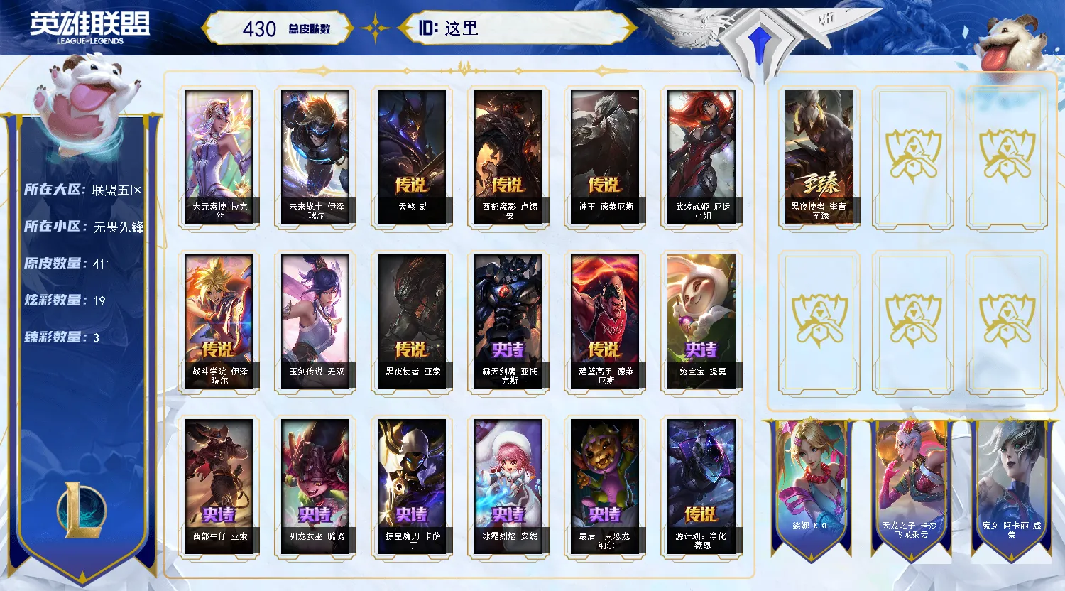 411皮肤 17炫彩 1臻彩 6神话/67限定/42传说/165英雄