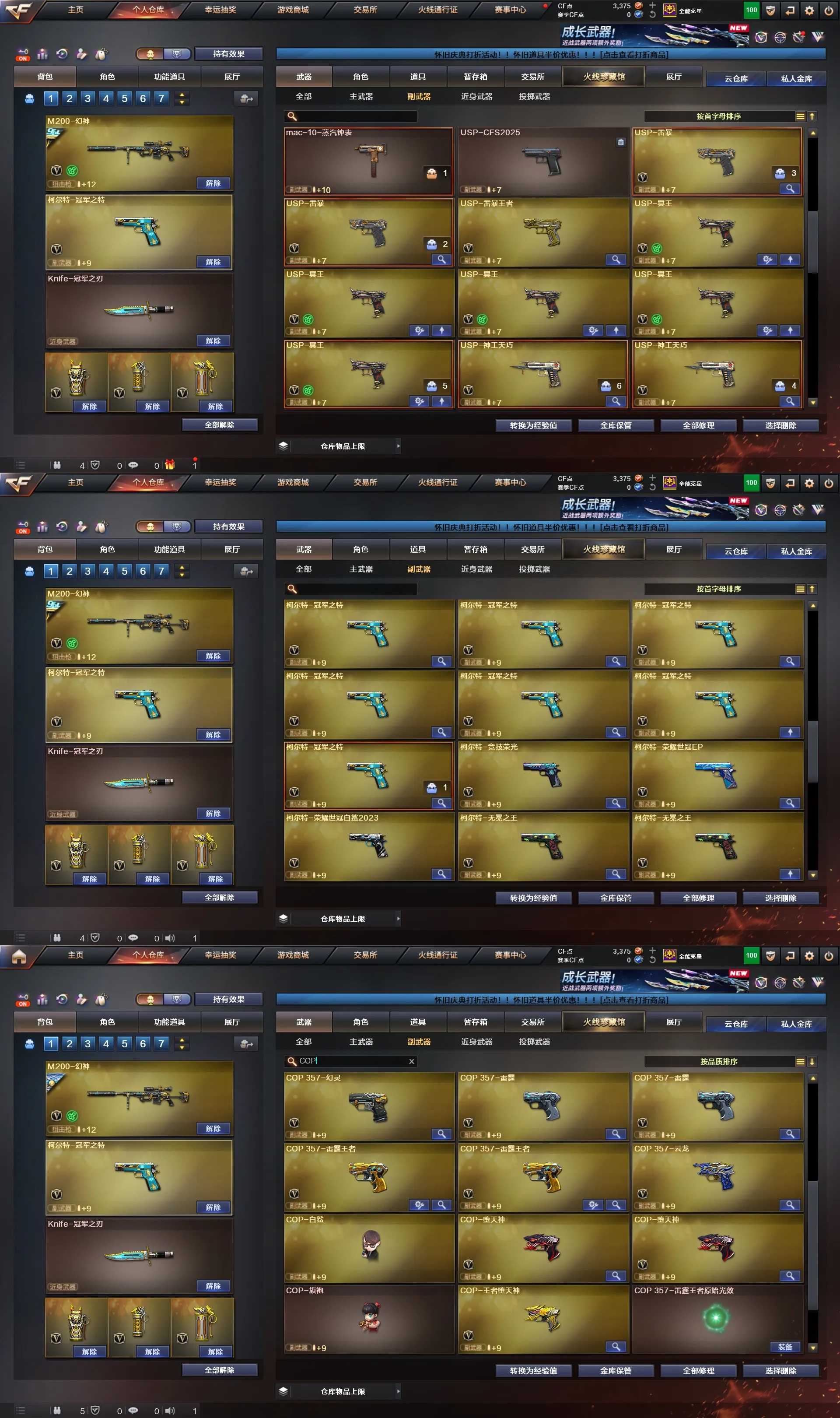 副武器(68把):传说破晓、USP-雷暴*2、USP雷暴王者*1、USP-冥王*5、USP-神工天巧*2、COP 357-幻灵*10、COP 357-雷霆*2、COP 357 雷霆王者*2、COP-堕天神*2、COP-王者堕天神、COP 357-云龙、柯尔特-冠军之特*7、无冕之王*2、柯尔特-荣耀世冠EP、柯尔特-荣耀世冠白鲨2023、荣耀世冠-柯尔特*2、柯尔特-竞技荣光、柯尔特-电竞装甲、破空枪刃-夜魔、沙鹰-修罗*11、沙鹰-天神*9、天神-动感闪耀、Anaconda-玄豹、Anaconda-量子之心、王者之魂