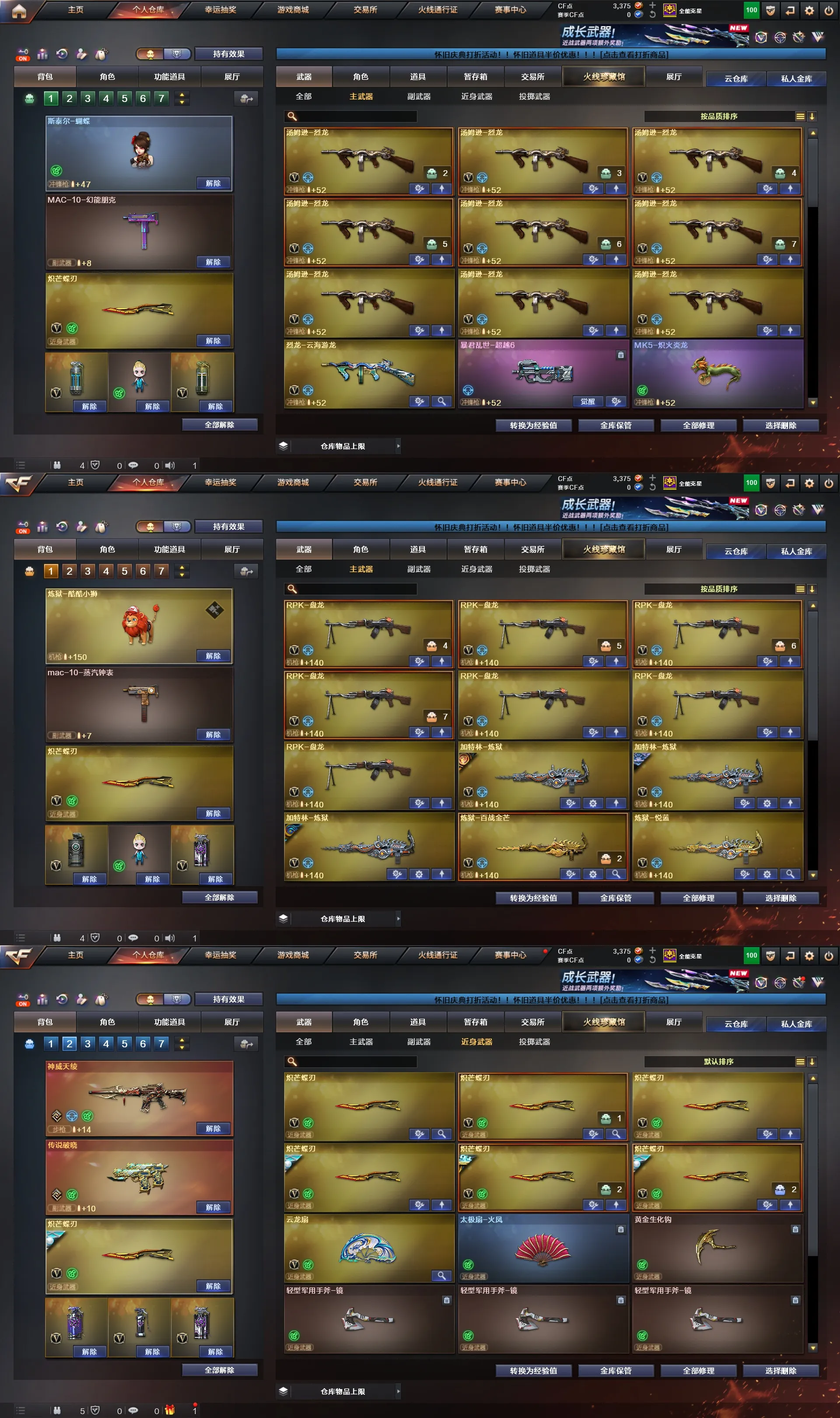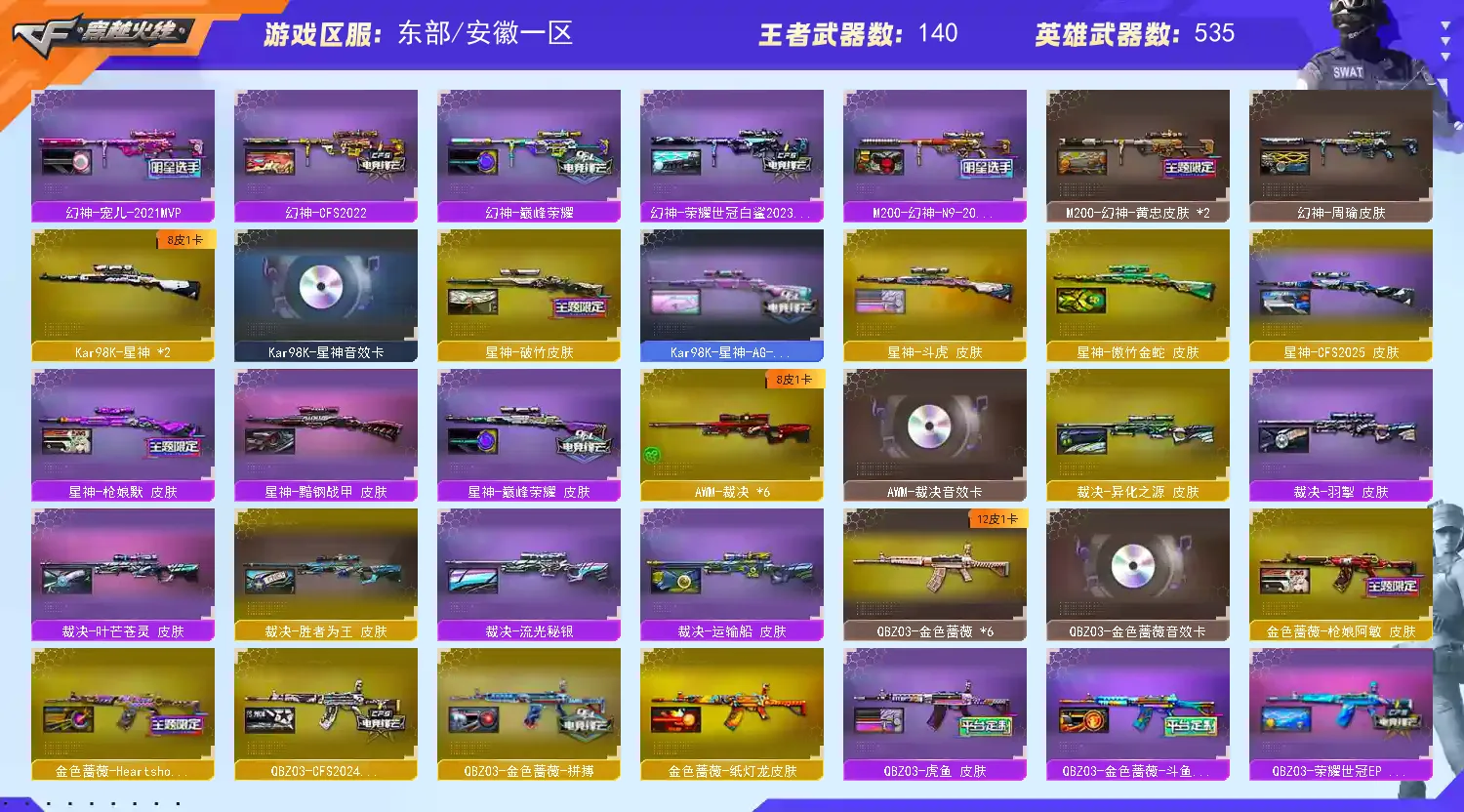 英雄级武器:幻神三件套(24皮肤+音效卡)、星神三件套(6皮肤+音效卡)、裁决三件套(7皮肤+音效卡)、毁灭三件套(17皮肤+音效卡)、白虎三件套(11皮肤+音效卡)、QBZ三件套(10皮肤+音效卡)、G36C幻影三件套、雷神三件套(22皮肤+音效卡)、火麒麟三件套(15皮肤+音效卡)、极光三件套、M14EBR-玄武三件套、QBZ03-天罚三件套、HK417-朱雀三件套、加利尔ACE-天袭、FAMAS-G2天戎、QBZ191-银翼、SCAR Light-玄豹、7盘9烈5炼狱、斯太尔-蝴蝶、炼狱-迷你小钢、炼狱-酷酷小狮