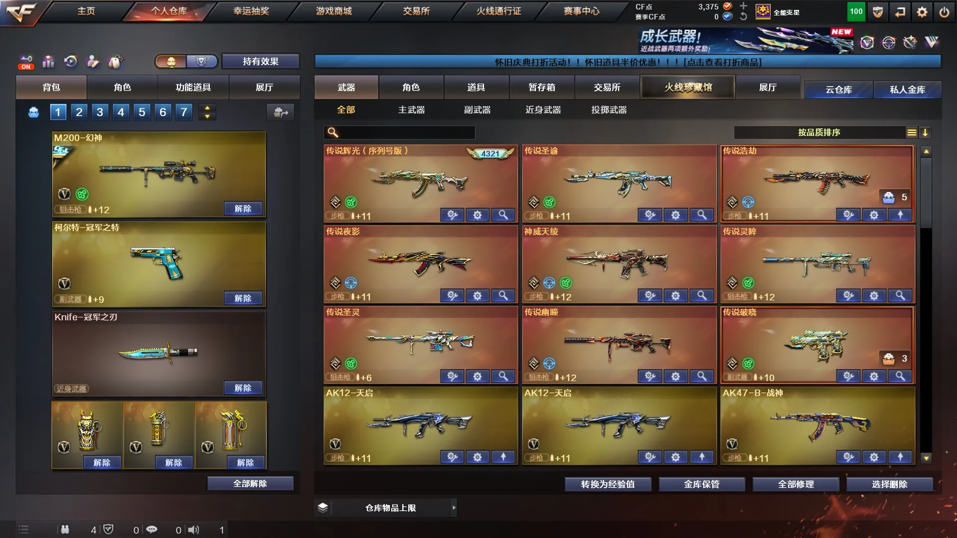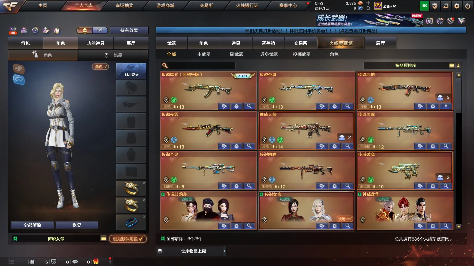 传说武器(9把):传说辉光序列号(4321)、神威天绫、传说灵眸、传说幽瞳、传说浩劫、传说圣谕、传说圣灵、传说夜影、传说破晓