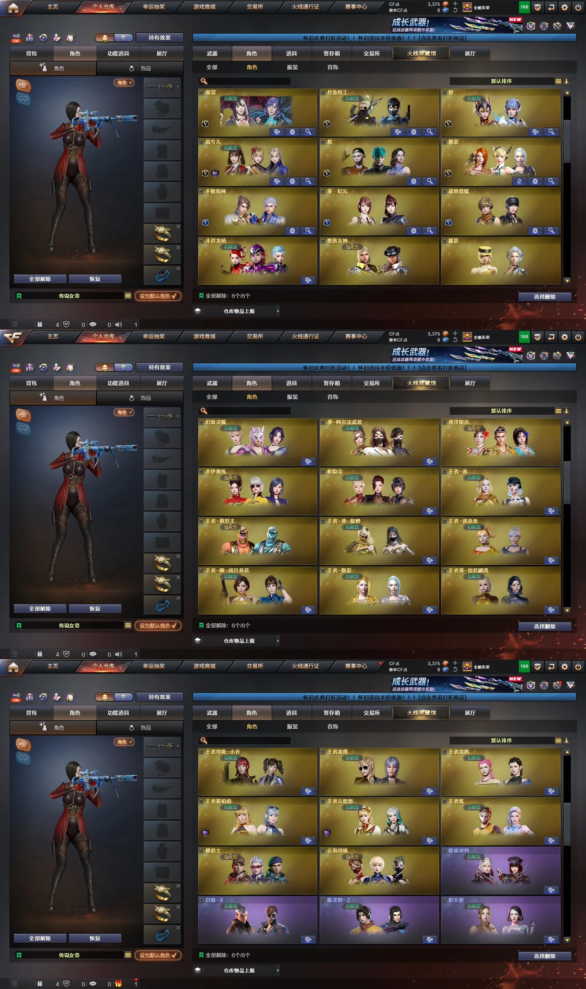 四防角色:传说女帝、神威莲华、传说艾莉莎、妮妮、鹰、春、沙漠玫瑰、晴雅、云悠悠、关小雨、雾萌萌、雨墨、华、荒漠琉璃、机械姬、兰-巾帼英雄、岚兮儿、枪娘樱、司雨、研、智、影豹、月兔特工