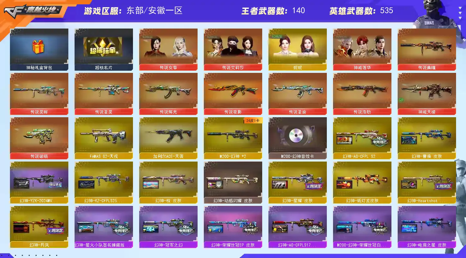幻神-YZK-2024MVP、幻神-荣耀世冠EP、幻神-星火小队签名臻藏版、幻神-冠军之幻、幻神-AG-CFPLS17冠军、幻神-AG-CFPL S24冠军、幻神-KZ-CFPLS25冠军、幻神-荣耀世冠白鲨2023、M200-幻神-荣耀世冠白鲨、幻神-电竞之星、幻神-巅峰荣耀、幻神-CFS2022、幻神-星耀、幻神-Heartshot、M200-幻神-N9-2022MVP、幻神-宠儿-2021MVP、幻神-纸灯龙、幻神-丹凤、幻神-动感闪耀、幻神-周瑜、幻神-曹操、幻神-权、M200-幻神-黄忠*2