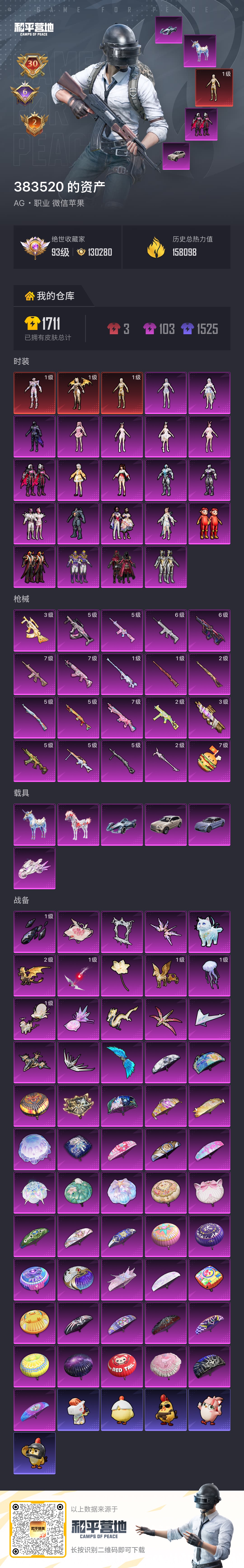 【苹果】 黄金木乃伊/红装3/巡查衣/奇异狩猎者/21粉/6载具/263套装/30王牌印记/159725热力值