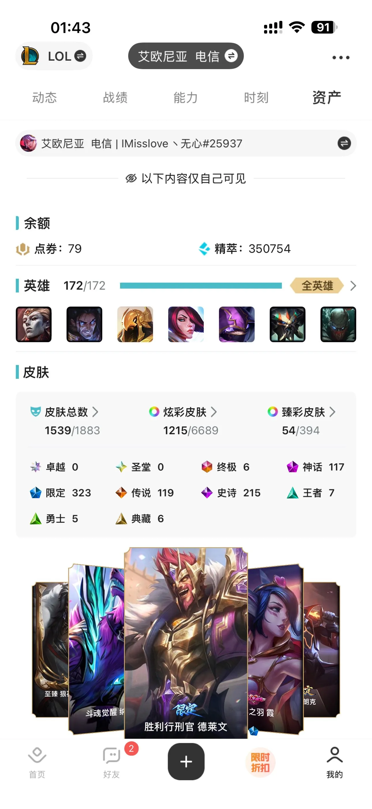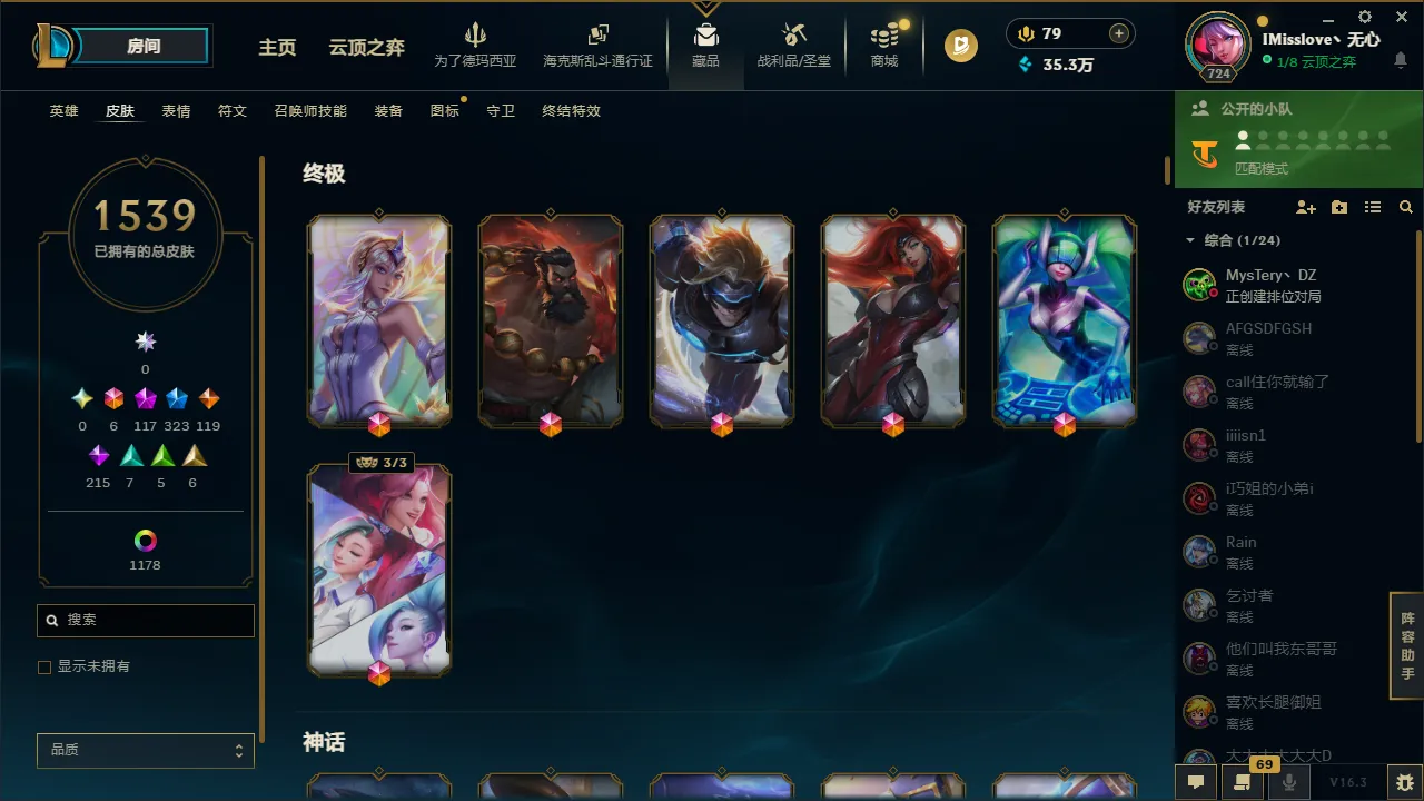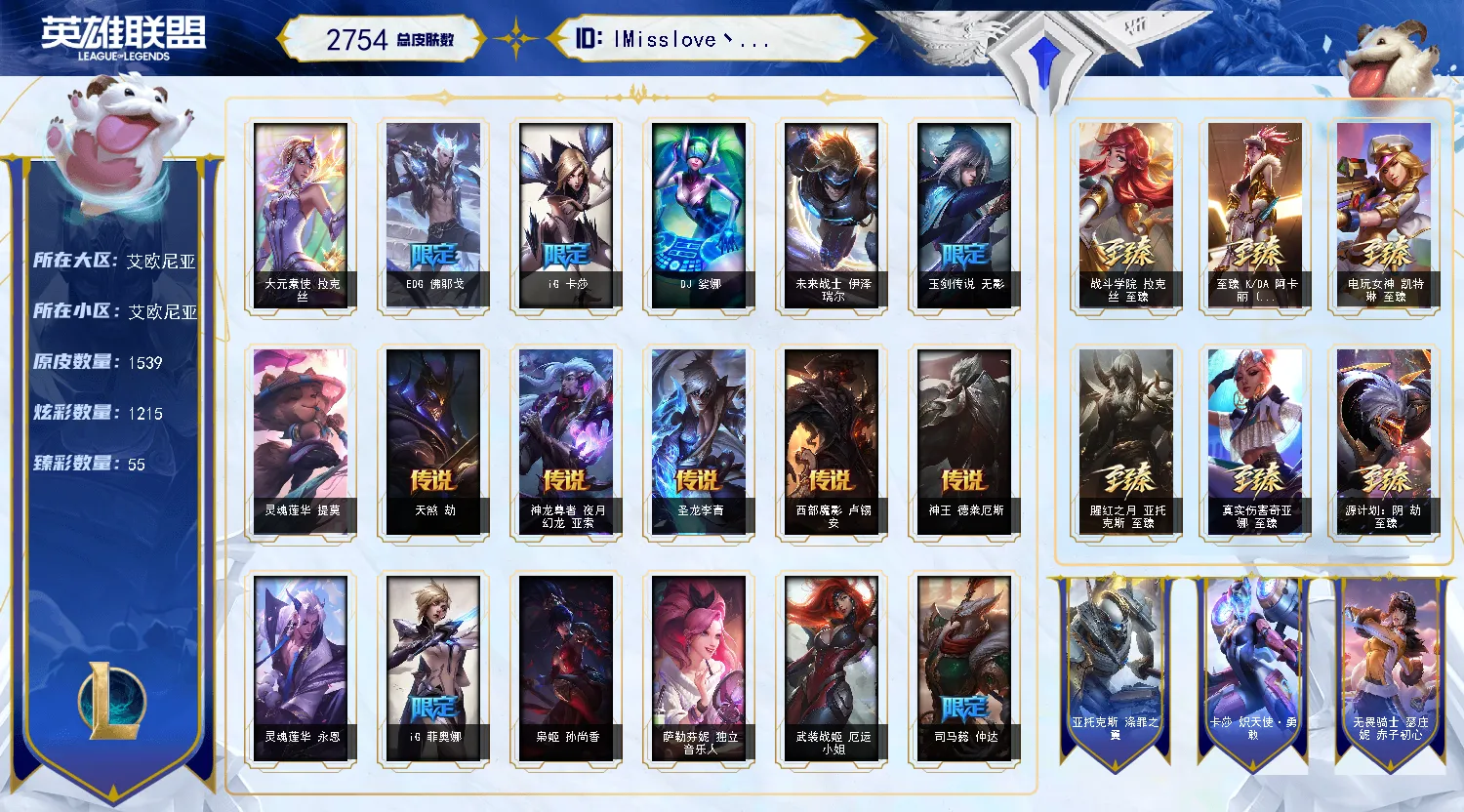 艾欧尼亚1539原皮、1178炫彩、323张限定、117神话。可下棋,拥有2个神话小英雄,有小小格温。52个棋盘。
