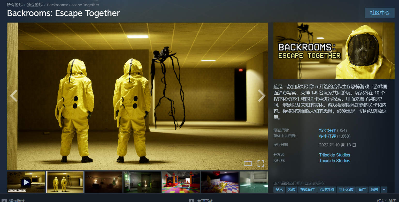 Backrooms: Escape Together 这是一款由虚幻引擎 5 打造的合作生存恐怖游戏,游戏画面逼真写实,支持 1-6 名玩家共同游玩。玩家将在 10 个程序化动态生成的关卡中进行探索,里面充满了阈限空间、谜题以及未知的实体。游戏会定期添加新的关卡和内容。你将时刻面临未知的恐惧,必须想尽一切办法逃离这里。
