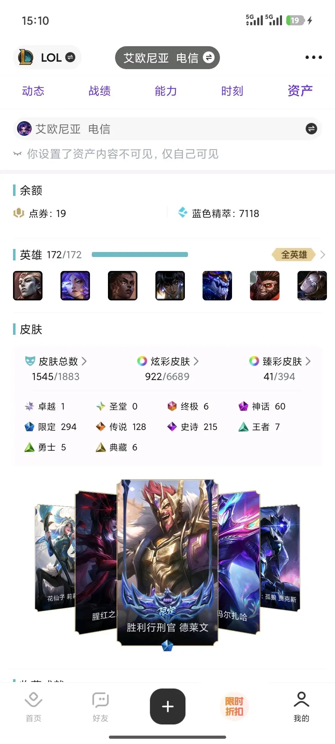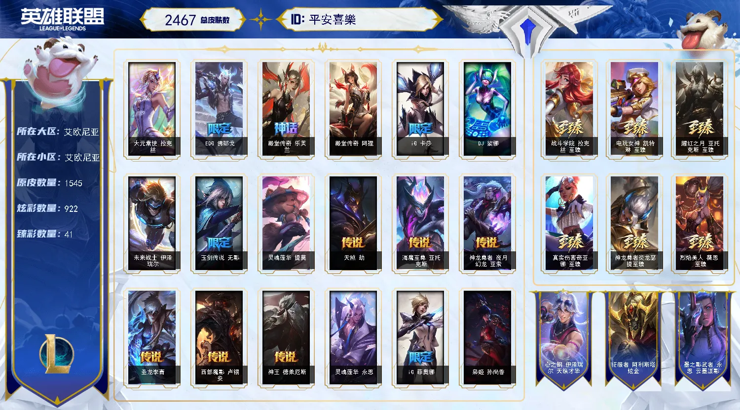 艾欧尼亚2400皮丨1545原皮丨922炫彩丨294限定丨60神话丨41臻彩