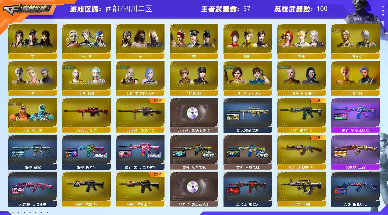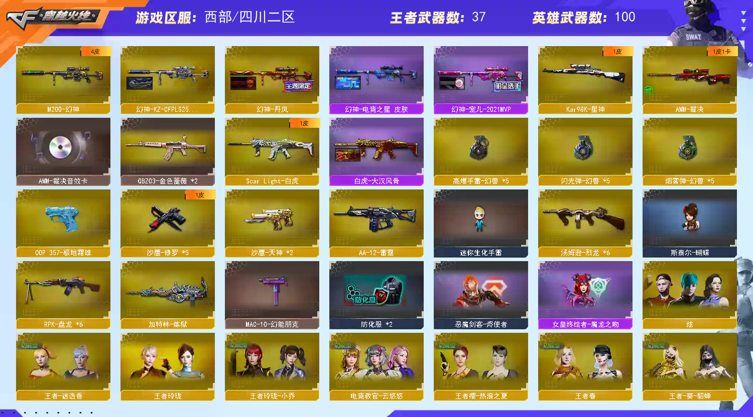 【M200-幻神+幻神-宠儿+kz25冠军+幻神-丹凤】【Kar98K-星神】【王者幻神】【幻兽套+幻兽雷*5】【ScarLight-白虎】【QBZ03-金色蔷薇】【生化 6盘龙 炼狱 6烈龙 死亡之眼 蝴蝶】【裁决+音效卡+星际旅行】【Barrett-毁灭+音效卡】【极光】【AK47-火麒麟+火麒麟-枪娘】【黑龙】【M4A1-雷神+雷神-宠儿+雷神-冠军之魄+雷神-荣耀之魄】【黑骑士+音效卡】【王者之心 王者之势 王者之戮 王者之魄 王者之光 王者之决】【无影 死神 黑武士 天启 黑鲨 青龙 】【15手枪 修罗*5 天神*2 王者之魂】【19近战 屠龙*6 龙啸 擎天*2 麒麟刺 王者之啸*4 王者之击*2 王者之刺】【手雷 雷暴王者】【角色 云悠悠 王者春 王者葵貂蝉 王者零国色天香 王者魅影 王者葵惊若翩鸿 王者玲珑小乔】【裁决音效卡 Barrett-毁灭音效卡】