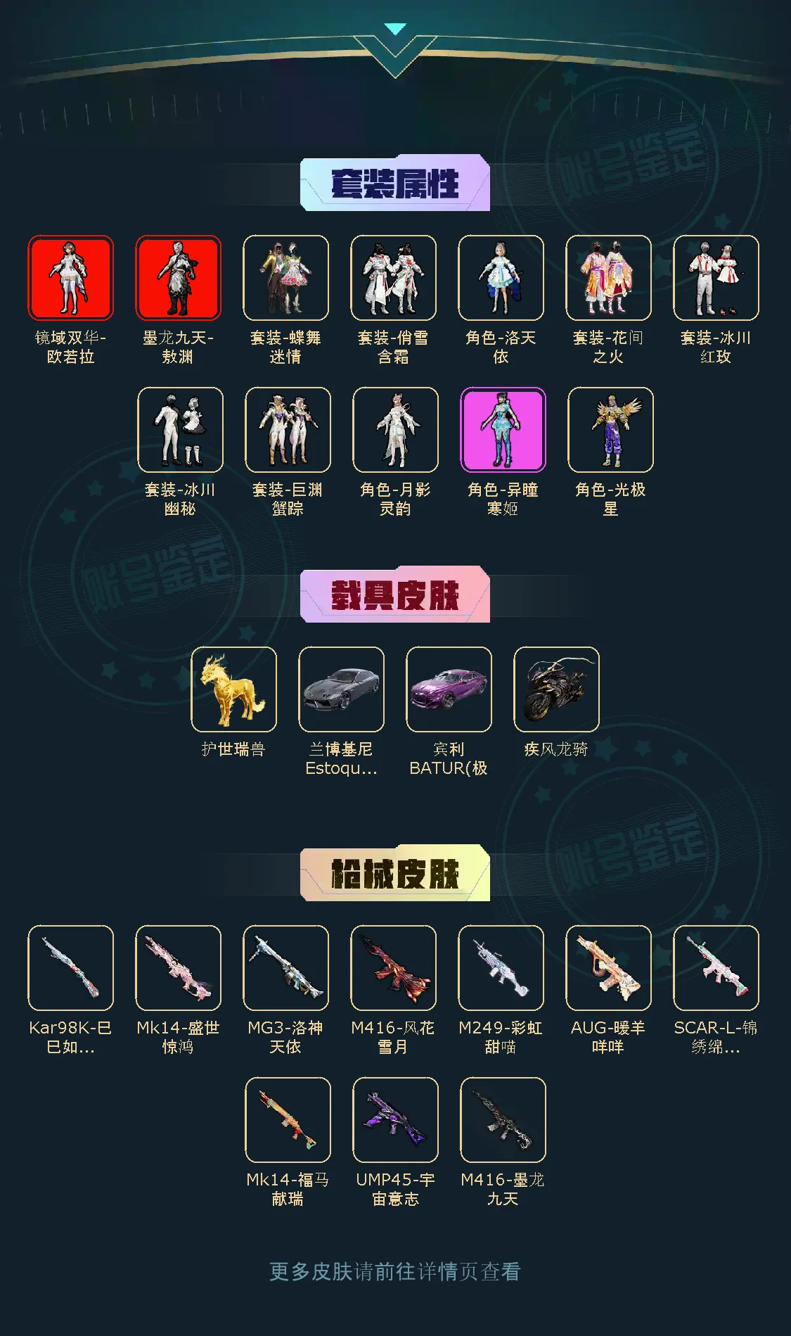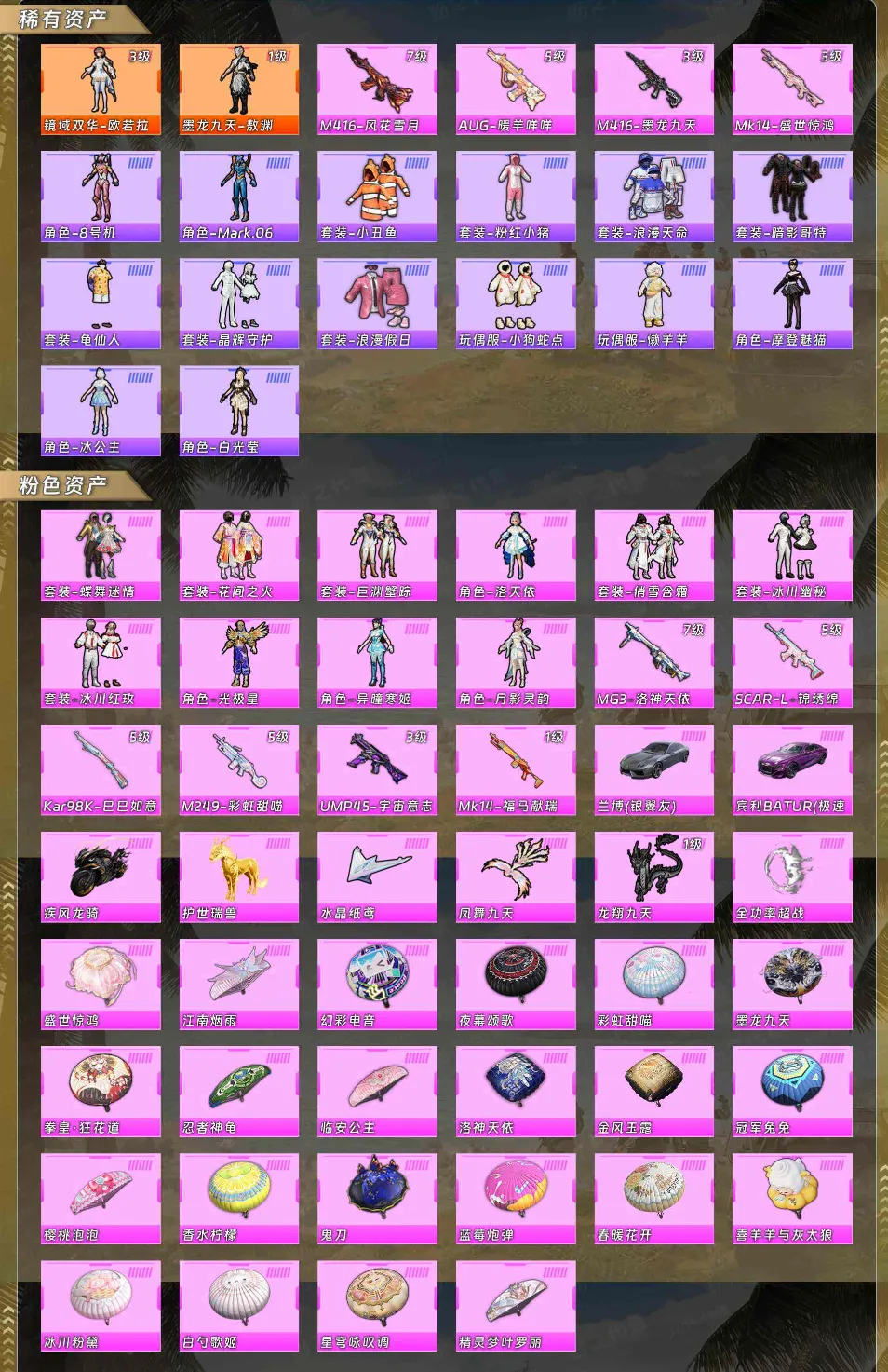 【稀有资产】镜域双华-欧若拉[3级]/墨龙九天-敖渊[1级]/M416-风花雪月/AUG-暖羊咩咩/M416-墨龙九天/Mk14-盛世惊鸿/角色-8号机/角色-Mark.06/套装-小丑鱼/套装-粉红小猪/套装-浪漫天命/套装-暗影哥特/套装-龟仙人/套装-晶辉守护/套装-浪漫假日/玩偶服-小狗蛇点点/玩偶服-懒羊羊/角色-摩登魅猫/角色-冰公主/角色-白光莹