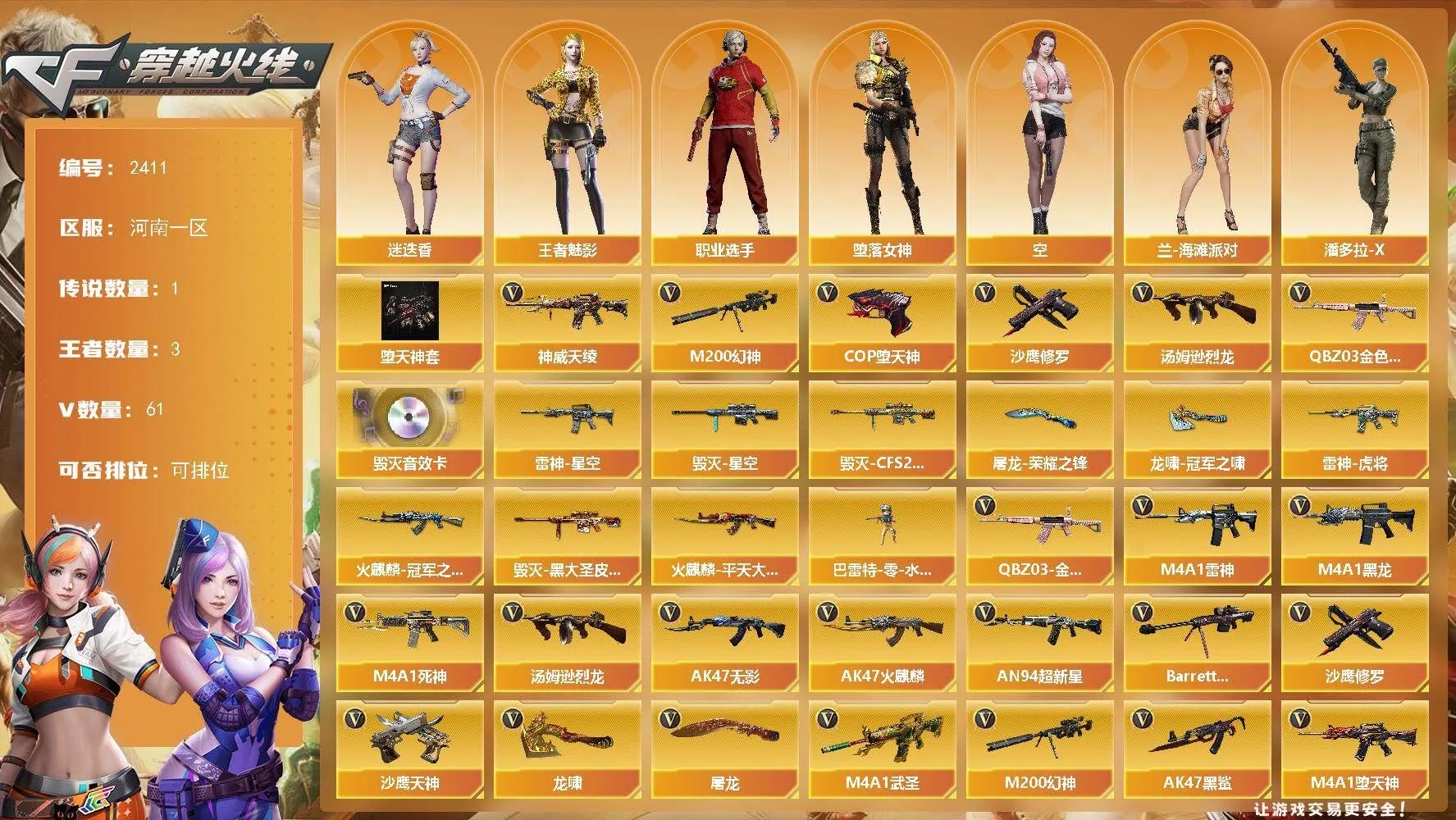 【传说武器】:神威天绫【热门武器】:QBZ03-金色蔷薇,M200-幻神,汤姆逊-烈龙,COP-堕天神*2,沙鹰-修罗【稀有套装】:堕天神套【音效卡】:Barrett-毁灭音效卡【皮肤】:雷神-星空,雷神-虎将,火麒麟-冠军之心,火麒麟-平天大圣,毁灭-星空,毁灭-CFS2020,毁灭-黑大圣皮肤,屠龙-荣耀之锋,龙啸-冠军之啸【角色】:迷迭香,四防王者-魅影,堕落女神,空,兰-海滩派对,潘多拉-X,邱刚敖,影武者-X,职业选手【人偶武器】:巴雷特-零-水下丽影【英雄级武器】:AK47-火麒麟,M4A1-黑龙*2,M4A1-雷神,AK47-无影*4,M4A1-死神,AN94-超新星*2,M4A1-武圣,AK47-黑鲨*2,M4A1-堕天神,QBZ03-金色蔷薇,AK-47-猩红传说,黑骑士-海王,Barrett-毁灭*2,M200-幻神,汤姆逊-烈龙,沙鹰-修罗,沙鹰-天神*3,COP-堕天神*2,王者之灵-觉醒版,屠龙,龙啸,麒麟刺-堕天神,龙啸-堕天神*2,擎天-CF网剧冠军,王者之锋-觉醒版,王者之啸-觉醒版,高爆手雷-雷霆,高爆手雷-堕天神*6,闪光弹-雷霆,闪光弹-堕天神*6,烟雾弹-雷霆,烟雾弹-堕天神*6【道具】:炫彩背包,超级背包,绿色巨人,灵魂忍者,迷雾幽灵,夺命之镰,防化服*2,防弹头盔*2,防弹衣*2,C4工具钳*2,手雷包*2【特殊枪械】:1烈龙,