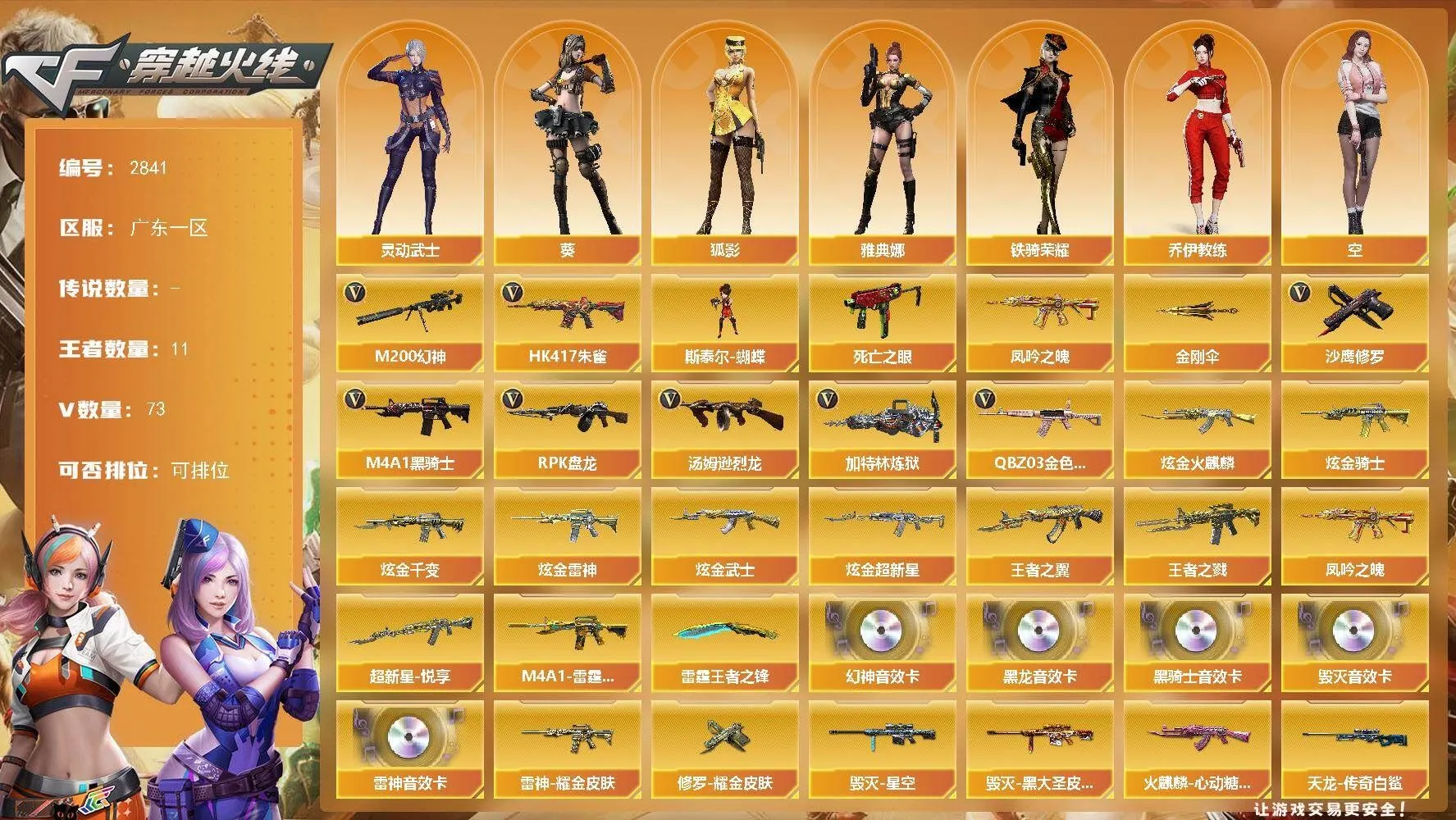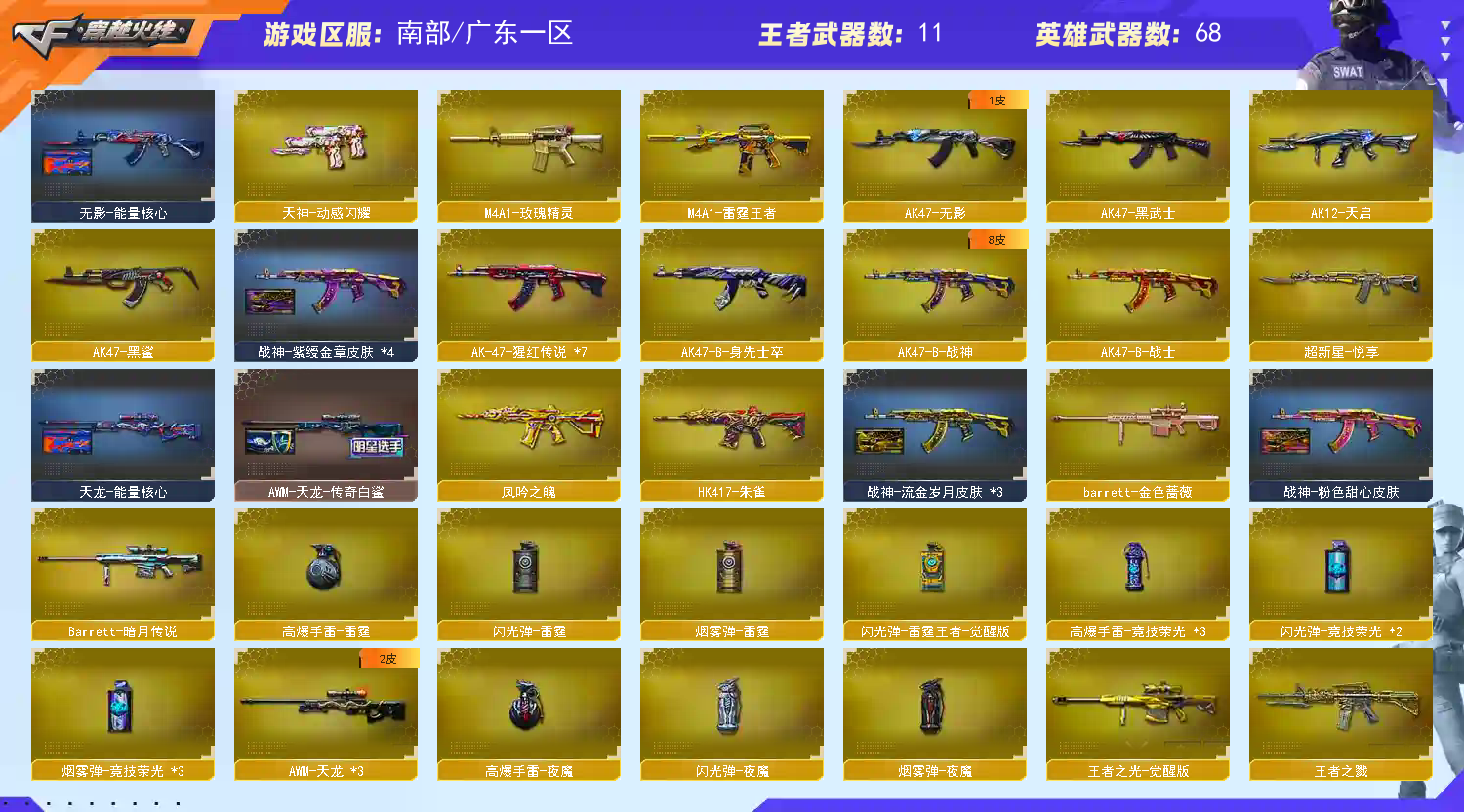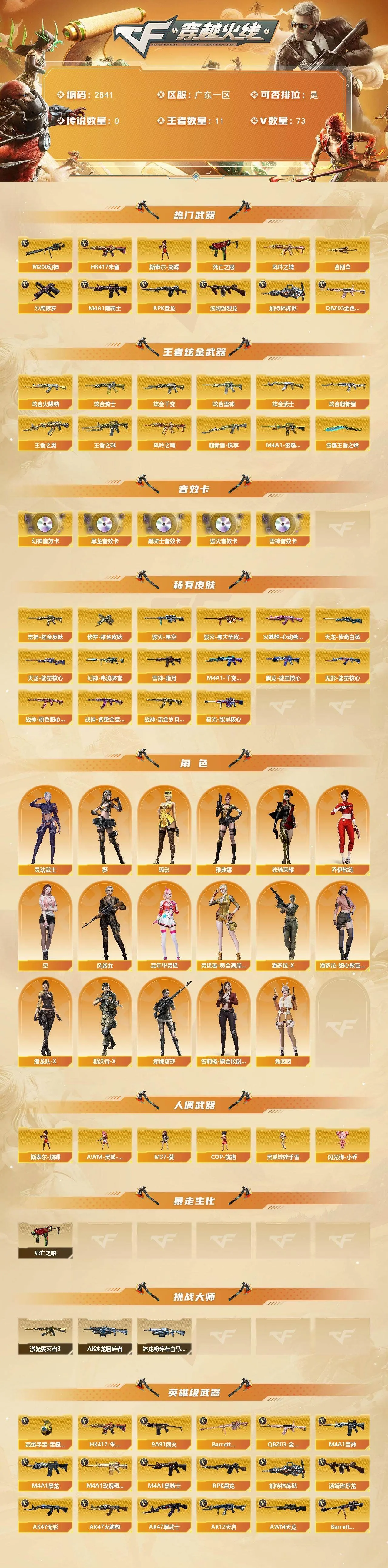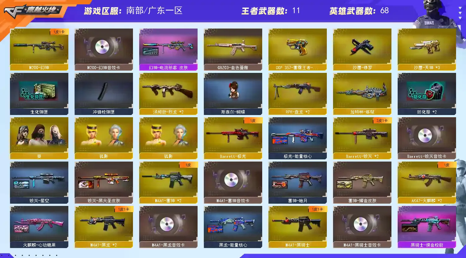 【热门武器】:QBZ03-金色蔷薇,HK417-朱雀,M200-幻神,死亡之眼,凤吟之魄,M4A1-黑骑士,汤姆逊-烈龙*2,RPK-盘龙*2,加特林-炼狱,斯泰尔-蝴蝶,沙鹰-修罗,金刚伞【王者炫金武器】:王者之戮,超新星-悦享,王者之翼,M4A1-雷霆王者,凤吟之魄,雷霆王者之锋,炫金火麒麟,炫金骑士,炫金千变,炫金雷神,炫金武士,炫金超新星【音效卡】:M200-幻神音效卡,M4A1-雷神音效卡,M4A1-黑龙音效卡,M4A1-黑骑士音效卡,Barrett-毁灭音效卡【皮肤】:幻神-电流骇客 皮肤,雷神-暗月,雷神-耀金皮肤,火麒麟-心动糖果,毁灭-星空,毁灭-黑大圣皮肤,M4A1-千变-孔明皮肤,黑龙-能量核心,无影-能量核心,战神-粉色甜心皮肤,战神-紫绶金章皮肤*4,战神-流金岁月皮肤*3,天龙-能量核心,AWM-天龙-传奇白鲨,极光-能量核心,修罗耀金皮肤【角色】:葵,狐影,乔伊教练,空,风暴女,嘉年华灵狐,灵动武士,灵狐者-黄金海岸,潘多拉-X,潘多拉-甜心教官,潜龙队-X,斯沃特-X,铁骑荣耀,兔囡囡,新娜塔莎,雪莉杨-摸金校尉,雅典娜【人偶武器】:斯泰尔-蝴蝶,AWM-灵狐-15周年嘉年华,M37-葵,COP-旗袍,闪光弹-小乔,灵狐娃娃手雷【暴走生化】:死亡之眼【挑战大师】:AK47-冰龙粉碎者*2,冰龙粉碎者-白马银枪,激光毁灭者III【英雄级武器】:AK47-火麒麟*2,M4A1-黑龙*2,M4A1-雷神*2,M4A1-黑骑士,AK47-无影,AK47-黑武士,AK12-天启,AK47-黑鲨,HK417-朱雀,M4A1-玫瑰精灵,QBZ03-金色蔷薇,9A91-烈火,AK-47-猩红传说*7,AK47-B-战神,AWM-天龙*3,Barrett-毁灭*2,Barrett-极光,M200-幻神,Barrett-金色蔷薇,王者之光-觉醒版,RPK-盘龙*2,加特林-炼狱,汤姆逊-烈龙*2,沙鹰-修罗,沙鹰-天神*3,COP 357-雷霆王者-觉醒版,天神-动感闪耀,屠龙*2,龙啸,马来剑-夜魔,擎天,麒麟刺,擎天-竞技荣光,屠龙-动感闪耀,王者之啸-觉醒版,高爆手雷-雷霆,高爆手雷-夜魔,高爆手雷-竞技荣光*3,手雷-动感闪耀,高爆手雷-雷霆王者-觉醒版,闪光弹-雷霆,闪光弹-夜魔,闪光弹-竞技荣光*2,闪光弹-雷霆王者-觉醒版,烟雾弹-雷霆,烟雾弹-夜魔,烟雾弹-竞技荣光*3【道具】:CFS限定背包,战舰背包,炫彩背包,超级背包,妩媚妖姬,黄金生化钩,绿色巨人,灵魂忍者,迷雾幽灵,生化弹匣,夺命之镰,防化服*2,金色流光-枪王排位*2,星辰流光-枪王排位,巅峰赛先锋-金色流光,枪王排位28赛季金色流光,枪王排位29赛季金色流光,EP战队名片,EP战队喷图,C4-沙漠,防弹头盔*6,防弹衣*5,C4工具钳*3,手雷包*4【特殊枪械】:蝴蝶斯泰尔+2烈龙,1黑骑士,2烈龙,2盘龙,1炼狱,1蝴蝶斯泰尔