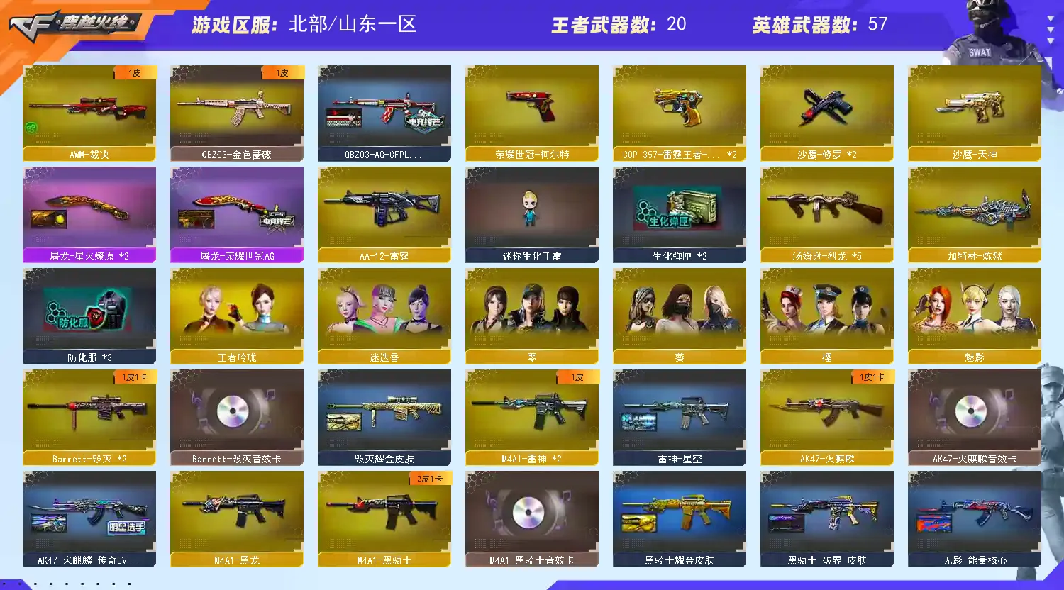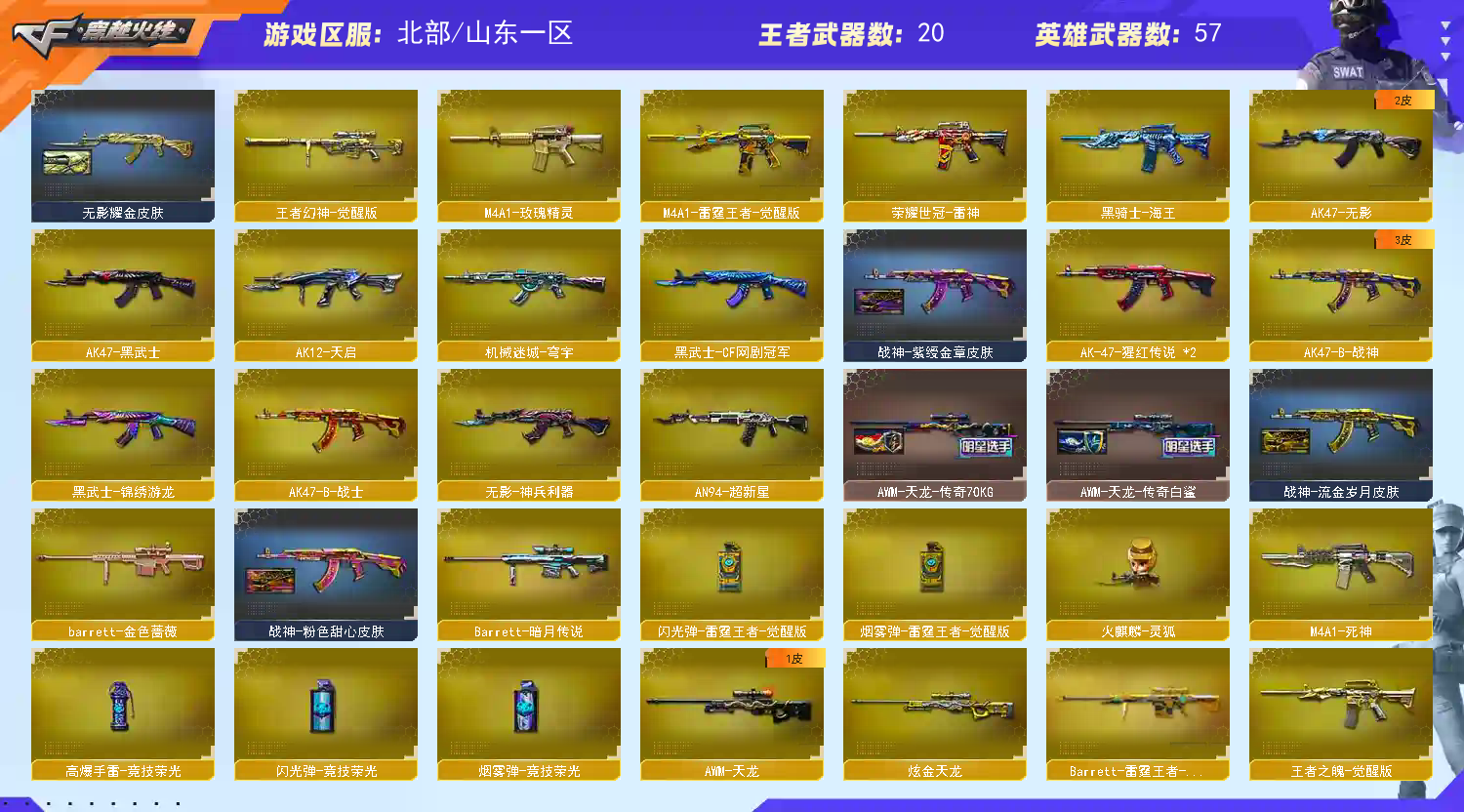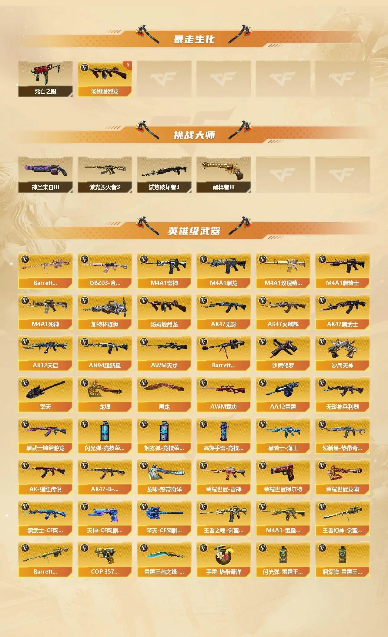 【热门武器】:QBZ03-金色蔷薇,死亡之眼,荣耀世冠-雷神,荣耀世冠-柯尔特,M4A1-黑骑士,汤姆逊-烈龙*5,加特林-炼狱,沙鹰-修罗*2,荣耀世冠-龙啸【稀有套装】:雷霆王者套,CF网剧冠军套【王者炫金武器】:王者之城,王者之怒*2,王者之灵,炫金骑士,炫金千变,炫金毁灭,炫金天龙,炫金修罗*2【音效卡】:AK47-火麒麟音效卡,M4A1-黑骑士音效卡,Barrett-毁灭音效卡【皮肤】:幻神-AG-CFPL S24冠军 皮肤,QBZ03-AG-CFPLS19冠军,雷神-星空,AK47-火麒麟-传奇EVEN,毁灭耀金皮肤,黑骑士耀金皮肤,黑骑士-破界 皮肤,无影-能量核心,无影耀金皮肤,战神-粉色甜心皮肤,战神-紫绶金章皮肤,战神-流金岁月皮肤,屠龙-荣耀世冠AG,屠龙-星火燎原*2【角色】:零,葵,樱,魅影,迷迭香,王者玲珑,奇洋探员,暗夜-X,北极狐-X,电竞少女,芳心审判者,飞虎队-X,嘉年华灵狐,娟娟,猎狐者-追月,灵狐者-X,灵狐者-黄金海岸,龙儿-小淘气,【人偶武器】:火麒麟-灵狐,AWM-灵狐-15周年嘉年华,M37-葵,COP-旗袍,迷你深渊冰龙,迷你裂空之翼,迷你波特博士*2,夺魂,迷你火种,闪光弹-小乔,灵狐娃娃手雷【暴走生化】:死亡之眼【挑战大师】:激光毁灭者III,试炼破坏者III,神圣爆裂者-末日III,阐释者III【英雄级武器】:AK47-火麒麟,M4A1-黑龙,M4A1-雷神*2,M4A1-黑骑士,AK47-无影,M4A1-死神,AK47-黑武士,AK12-天启,AN94-超新星,无影-神兵利器,黑武士-锦绣游龙,超新星-热带奇洋,M4A1-玫瑰精灵,QBZ03-金色蔷薇,王者之魄-觉醒版,AK-47-猩红传说*2,AK47-B-战神,黑骑士-海王,M4A1-雷霆王者-觉醒版,荣耀世冠-雷神,黑武士-CF网剧冠军,AWM-天龙,Barrett-毁灭*2,AWM-裁决,Barrett-金色蔷薇,王者幻神-觉醒版,Barrett-雷霆王者-觉醒版,加特林-炼狱,汤姆逊-烈龙*5,AA-12-雷霆,沙鹰-修罗*2,沙鹰-天神,COP 357-雷霆王者-觉醒版*2,荣耀世冠-柯尔特,天神-CF网剧冠军,屠龙*3,龙啸,擎天,龙啸-热带奇洋,荣耀世冠-龙啸,擎天-CF网剧冠军,雷霆王者之锋-觉醒版,【道具】:AG战队炫彩背包,冰冰背包,奇洋探员-海龟背包,炫彩背包,热带奇洋炫彩背包,臻选金狐背包,虎牙炫彩背包,超级背包*2,黄金曼提柯尔的背包