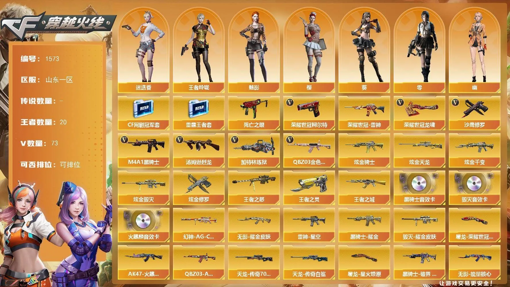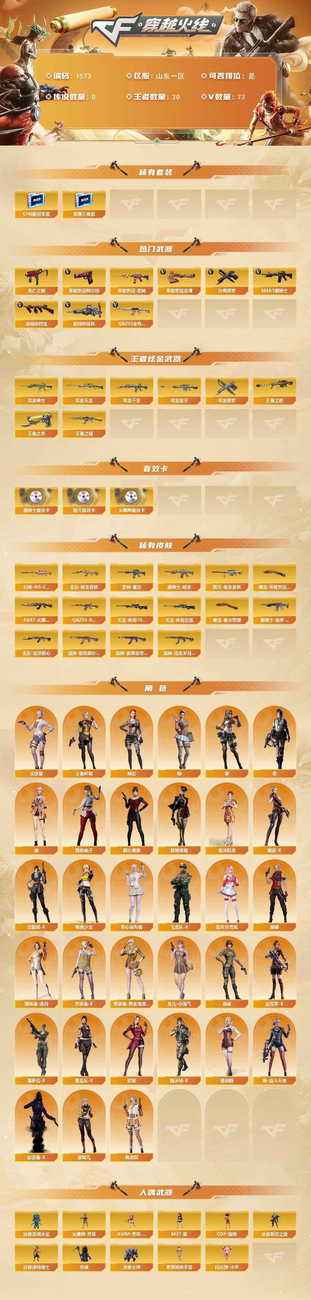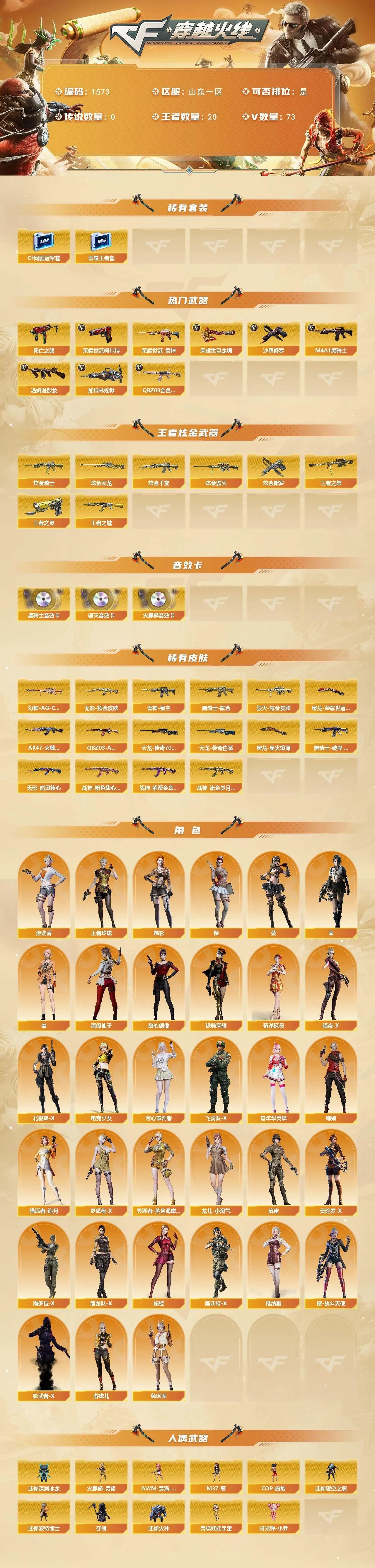 【热门武器】:QBZ03-金色蔷薇,死亡之眼,荣耀世冠-雷神,荣耀世冠-柯尔特,M4A1-黑骑士,汤姆逊-烈龙*5,加特林-炼狱,沙鹰-修罗*2,荣耀世冠-龙啸【稀有套装】:雷霆王者套,CF网剧冠军套【王者炫金武器】:王者之城,王者之怒*2,王者之灵,炫金骑士,炫金千变,炫金毁灭,炫金天龙,炫金修罗*2【音效卡】:AK47-火麒麟音效卡,M4A1-黑骑士音效卡,Barrett-毁灭音效卡【皮肤】:幻神-AG-CFPL S24冠军 皮肤,QBZ03-AG-CFPLS19冠军,雷神-星空,AK47-火麒麟-传奇EVEN,毁灭耀金皮肤,黑骑士耀金皮肤,黑骑士-破界 皮肤,无影-能量核心,无影耀金皮肤,战神-粉色甜心皮肤,战神-紫绶金章皮肤,战神-流金岁月皮肤,屠龙-荣耀世冠AG,屠龙-星火燎原*2【角色】:零,葵,樱,魅影,迷迭香,王者玲珑,奇洋探员,暗夜-X,北极狐-X,电竞少女,芳心审判者,飞虎队-X,嘉年华灵狐,娟娟,猎狐者-追月,灵狐者-X,灵狐者-黄金海岸,龙儿-小淘气,【人偶武器】:火麒麟-灵狐,AWM-灵狐-15周年嘉年华,M37-葵,COP-旗袍,迷你深渊冰龙,迷你裂空之翼,迷你波特博士*2,夺魂,迷你火种,闪光弹-小乔,灵狐娃娃手雷【暴走生化】:死亡之眼【挑战大师】:激光毁灭者III,试炼破坏者III,神圣爆裂者-末日III,阐释者III【英雄级武器】:AK47-火麒麟,M4A1-黑龙,M4A1-雷神*2,M4A1-黑骑士,AK47-无影,M4A1-死神,AK47-黑武士,AK12-天启,AN94-超新星,无影-神兵利器,黑武士-锦绣游龙,超新星-热带奇洋,M4A1-玫瑰精灵,QBZ03-金色蔷薇,王者之魄-觉醒版,AK-47-猩红传说*2,AK47-B-战神,黑骑士-海王,M4A1-雷霆王者-觉醒版,荣耀世冠-雷神,黑武士-CF网剧冠军,AWM-天龙,Barrett-毁灭*2,AWM-裁决,Barrett-金色蔷薇,王者幻神-觉醒版,Barrett-雷霆王者-觉醒版,加特林-炼狱,汤姆逊-烈龙*5,AA-12-雷霆,沙鹰-修罗*2,沙鹰-天神,COP 357-雷霆王者-觉醒版*2,荣耀世冠-柯尔特,天神-CF网剧冠军,屠龙*3,龙啸,擎天,龙啸-热带奇洋,荣耀世冠-龙啸,擎天-CF网剧冠军,雷霆王者之锋-觉醒版,【道具】:AG战队炫彩背包,冰冰背包,奇洋探员-海龟背包,炫彩背包,热带奇洋炫彩背包,臻选金狐背包,虎牙炫彩背包,超级背包*2,黄金曼提柯尔的背包