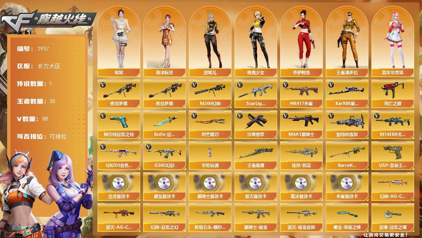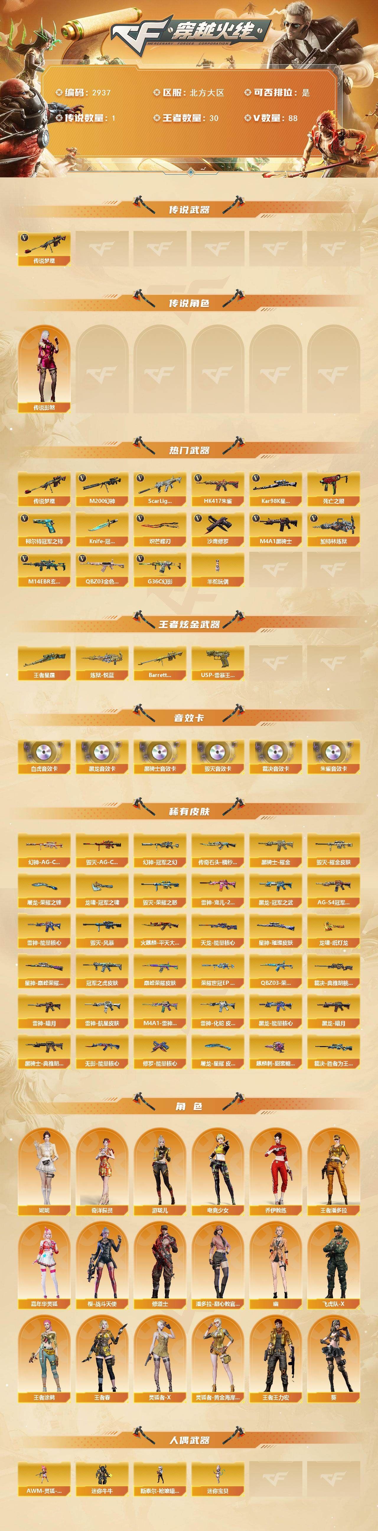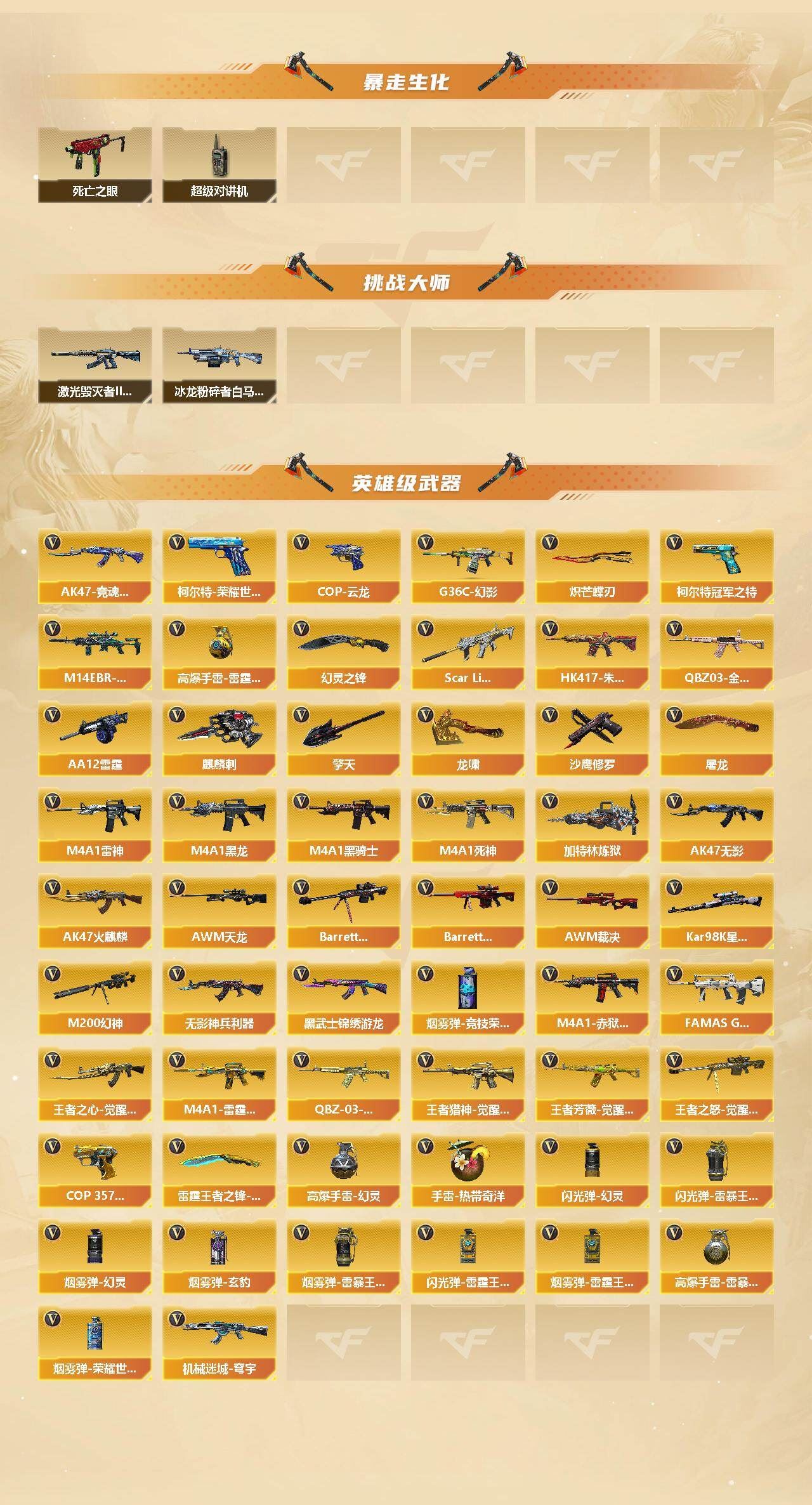 【传说武器】:传说梦魇【传说角色】:传说影煞【热门武器】:传说梦魇,G36C-幻影,QBZ03-金色蔷薇*2,M14EBR-玄武,Scar Light-白虎,HK417-朱雀,M200-幻神,死亡之眼*2,柯尔特-冠军之特,Kar98K-星神,M4A1-黑骑士,加特林-炼狱,羊驼玩偶*4,沙鹰-修罗*3,Knife-冠军之刃*2,炽芒蝶刃【王者炫金武器】:Barrett-雷霆王者,王者星霆,炼狱-悦蓝,USP-雷暴王者*2【音效卡】:M4A1-黑龙音效卡,M4A1-黑骑士音效卡,Barrett-毁灭音效卡,AWM-裁决音效卡,Scar Light-白虎音效卡,HK417-朱雀音效卡【皮肤】:幻神-冠军之幻,幻神-AG-CFPL S24冠军 皮肤,幻神-荣耀世冠EP 皮肤,ScarLight-白虎-冠军之虎皮肤,QBZ03-巅峰荣耀皮肤,QBZ03-荣耀世冠EP 皮肤,裁决-典雅胡桃 皮肤,裁决-胜者为王 皮肤,星神-璀璨皮肤,星神-巅峰荣耀 皮肤,雷神-暗月,雷神-能量核心,雷神-宠儿-2019MVP,雷神-航星皮肤,M4A1-雷神-巅峰荣耀皮肤,雷神-化蛇 皮肤,传奇石头-横秒之巅,火麒麟-平天大圣,毁灭-荣耀之怒,毁灭耀金皮肤,毁灭-AG-CFPLS15冠军,毁灭-风暴,黑龙-能量核心,黑龙-暗月,黑龙-冠军之武,黑骑士耀金皮肤,黑骑士-AG-S4冠军典藏,黑骑士-典雅胡桃 皮肤,无影-能量核心,天龙-能量核心,修罗-能量核心*2,屠龙-荣耀之锋*2,屠龙-星耀 皮肤,龙啸-冠军之啸,龙啸-纸灯龙皮肤,麒麟刺-甜蜜糖果 皮肤【角色】:葵,妮妮,王者春,王者涂鸦,王者王力宏,王者潘多拉,奇洋探员,乔伊教练,修道士,电竞少女,飞虎队-X,嘉年华灵狐,灵狐者-X,灵狐者-黄金海岸,潘多拉-甜心教官,樱-战斗天使,幽,游珑儿【人偶武器】:迷你宝贝,斯泰尔-枪娘暗刃,AWM-灵狐-15周年嘉年华,迷你牛牛【暴走生化】:死亡之眼*2,超级对讲机【挑战大师】:冰龙粉碎者-白马银枪,激光毁灭者III-白马银枪【英雄级武器】:AK47-火麒麟*2,M4A1-黑龙,M4A1-雷神*2,M4A1-黑骑士,AK47-无影,M4A1-死神,HK417-朱雀,Scar Light-白虎,M14EBR-玄武,无影-神兵利器,G36C-幻影,黑武士-锦绣游龙,FAMAS G2-天戎,QBZ03-金色蔷薇*2,王者之心-觉醒版,M4A1-雷霆王者-觉醒版,QBZ-03-王者蔷薇-觉醒版,王者猎神-觉醒版,王者芳薇-觉醒版,机械迷城-穹宇,AWM-天龙,Barrett-毁灭,Barrett-极光,AWM-裁决,M200-幻神,Kar98K-星神,王者之怒-觉醒版,加特林-炼狱,AA-12-雷霆,沙鹰-修罗*3,COP 357-雷霆王者-觉醒版*2,柯尔特-冠军之特,柯尔特-荣耀世冠EP*2,COP 357-云龙,屠龙*3,龙啸,擎天,麒麟刺,幻灵之锋,炽芒蝶刃,雷霆王者之锋-觉醒版,高爆手雷-幻灵*6,手雷-热带奇洋,高爆手雷-雷霆王者-觉醒版*7,高爆手雷-雷暴王者,闪光弹-幻灵*3,闪光弹-雷暴王者*5,闪光弹-雷霆王者-觉醒版,烟雾弹-幻灵,烟雾弹-竞技荣光,烟雾弹-玄豹*2,烟雾弹-雷暴王者,烟雾弹-雷霆王者-觉醒版,烟雾弹-荣耀世冠EP*5,M4A1-赤狱骑士,AK47-竞魂无影【道具】:CFS限定背包,云山科技背包,亚洲杯纪念炫彩背包,冰冰背包,奇洋探员-海龟背包,战舰背包,炫彩背包,超级背包,女皇终结者-魔龙之吻,救世主-黑桃战神,绿色巨人,灵魂忍者*2,变异宝贝,迷雾幽灵,生化弹匣,夺命之镰,防化服*3,金色流光-枪王排位,星辰流光-枪王排位,枪王排位28赛季金色流光,枪王排位29赛季金色流光,CFPL选手表情-第1套,EP战队名片,EP战队喷图,EP战队击杀图标,防弹头盔*8,防弹衣*8,C4工具钳*8,手雷包*8【特殊枪械】:1白虎,1黑骑士,1炼狱