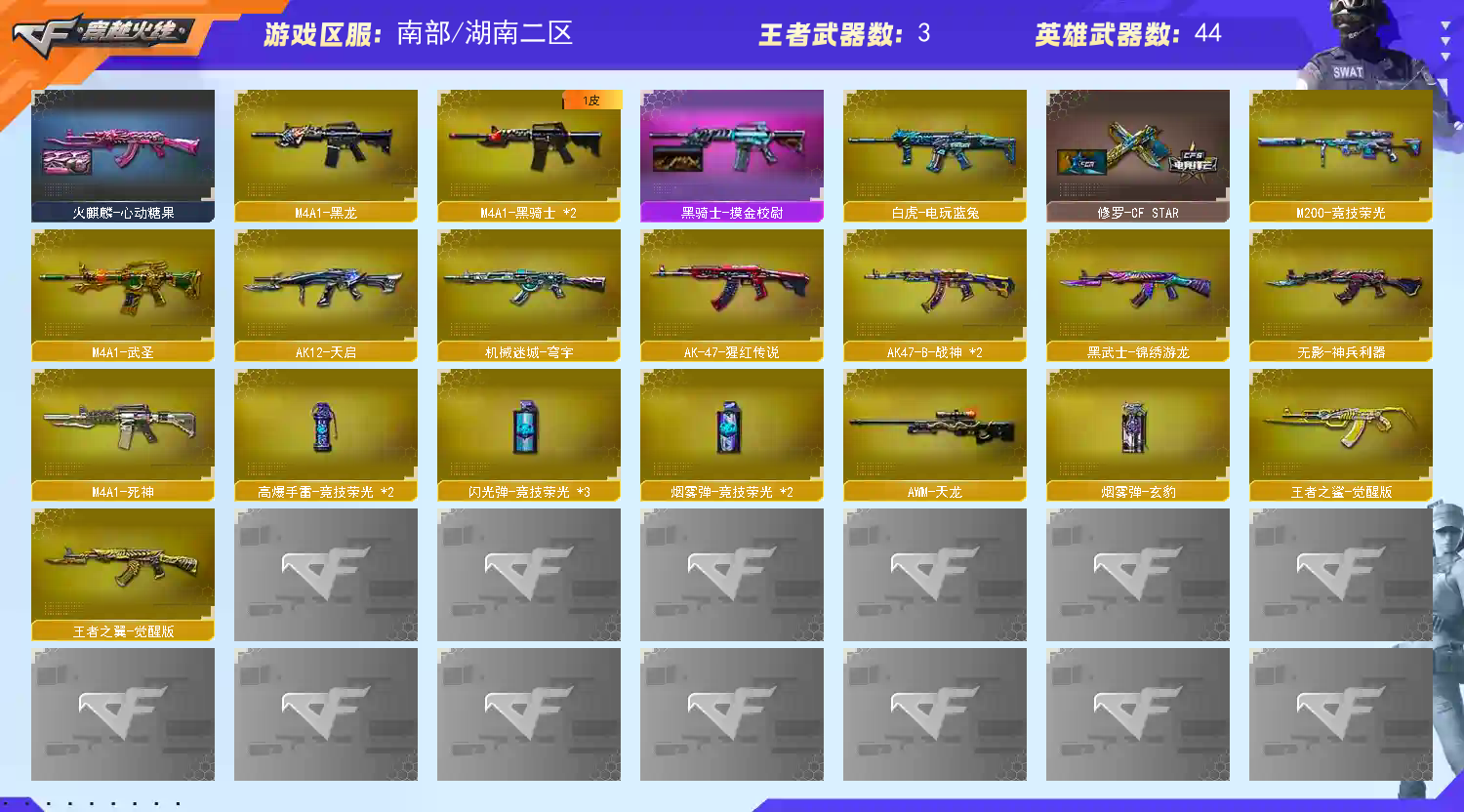 【M200-幻神+幻神-电流骇客+幻神星火小队】【竞技荣光套+四防云悠悠+usp雷暴】【Kar98K-星神+傲竹金蛇】【ScarLight-白虎电玩蓝兔】【ScarLight-白虎+ag20冠军】【QBZ03-金色蔷薇】【裁决+音效卡+裁决-流光秘银+运输船】【Barrett-毁灭】【极光】【AK47-火麒麟】【黑龙】【M4A1-雷神+雷神-传奇n9】【黑骑士】【王者之翼 王者之势】【死神 天启 】【7手枪 修罗 usp雷暴 usp十个勤天 柯尔特荣耀世冠白鲨2023 王者之灵】【5近战 屠龙*2 擎天 麒麟刺】【手雷 竞技荣光】【四防 王者春】【裁决音效卡】