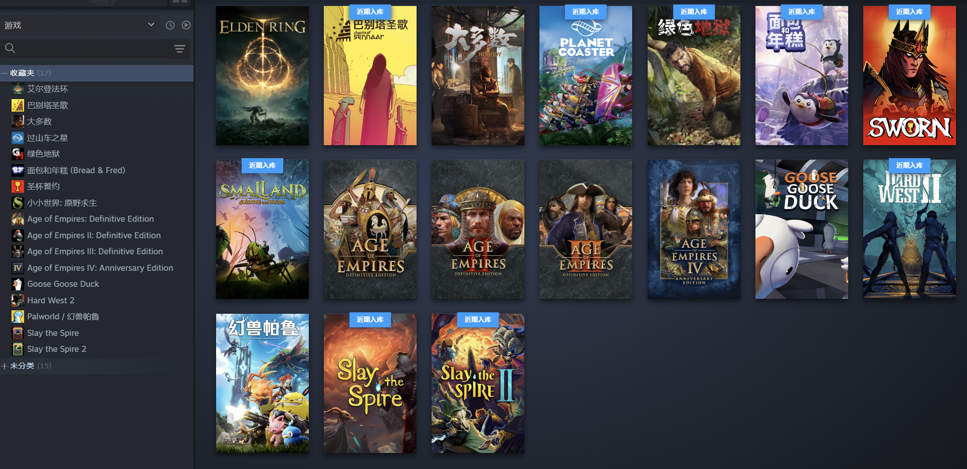 攀爬动物在一起/动物攀登((Climber Animals: Together)、杀戮尖塔2(Slay the Spire 2)、杀戮尖塔1、面包和年糕(Bread & Fred)、小小世界原野求生(SMALLAND)、艾尔登法环、大多数、帝国时代4/帝国时代四、帝国时代3、帝国时代2、帝国时代1、鹅鸭杀、绿色地狱/丛林地狱(Green Hell)、圣杯誓约、巴别塔圣歌(Chants of Sennaar)、过山车之星(Planet Coaster)、血战西部2(Hard West 2)、幻兽帕鲁(Palworld)