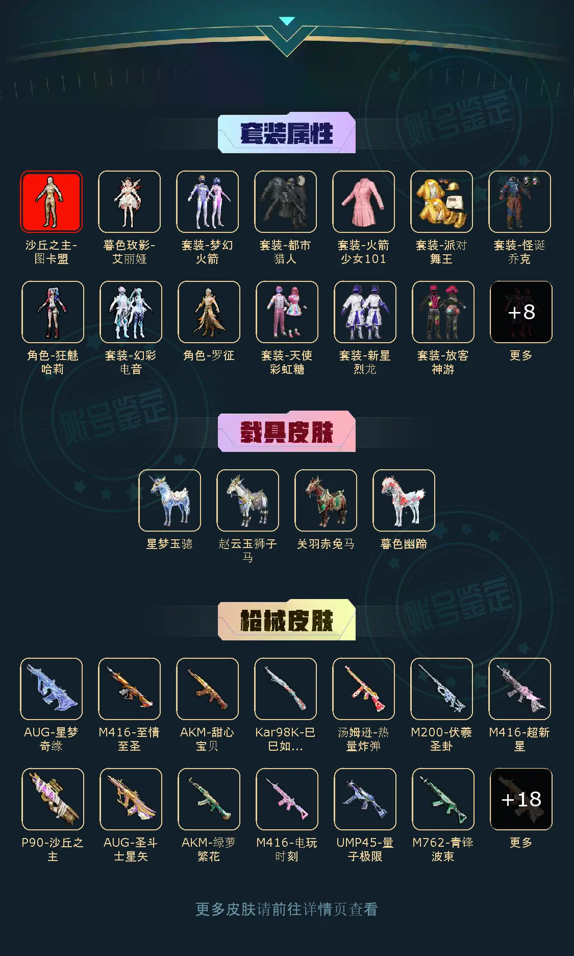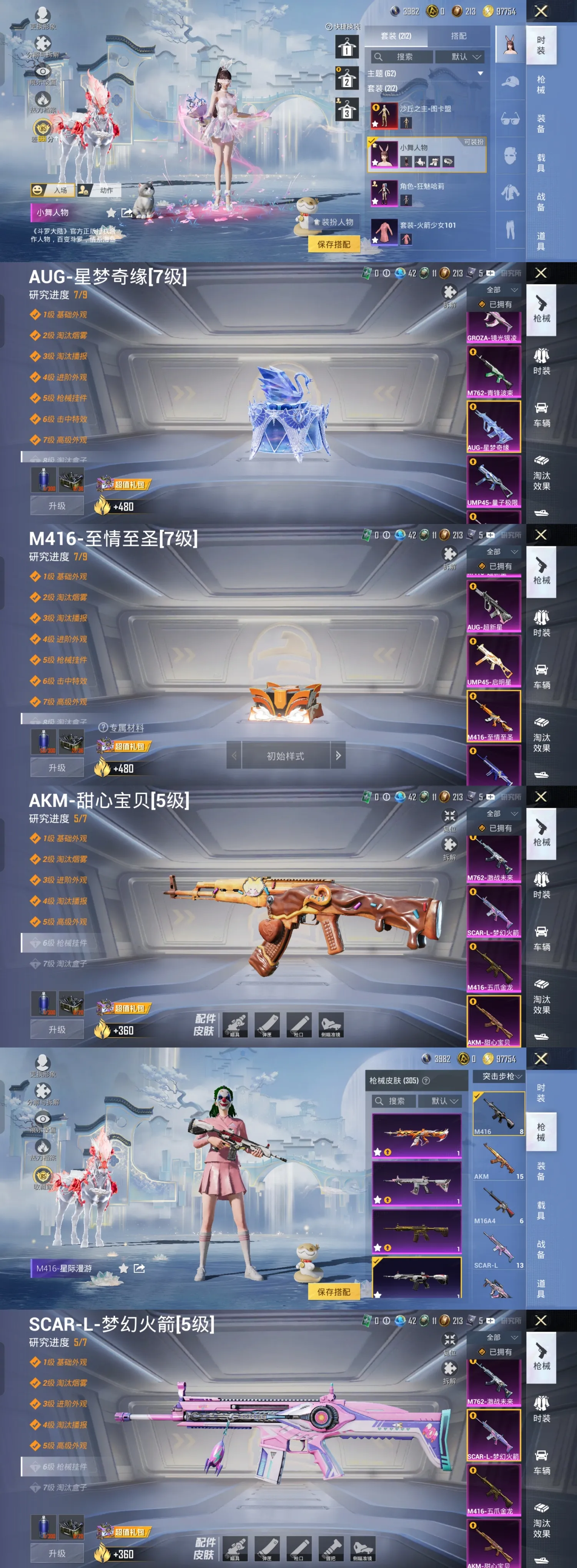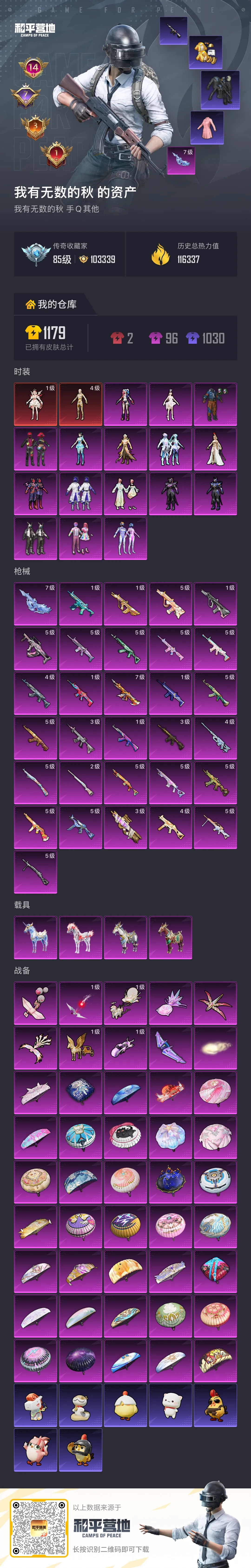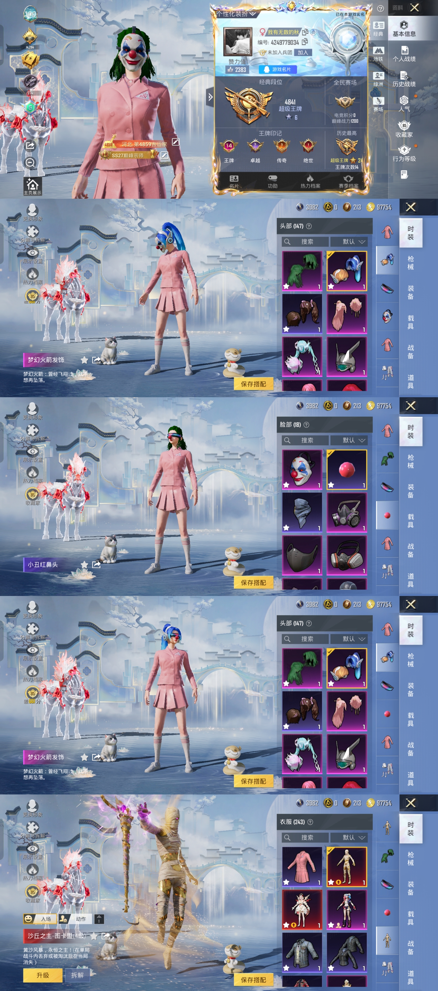超级王牌6星18粉,4载具,212套装,14王牌印记,超级王牌24星历史最高段,116337热力值 AKM-甜心宝贝/SCAR-L-梦幻火箭/AUG-星梦奇缘/AKM-绿萝繁花/M416-电玩时刻/M762-激战未来/AUG-圣斗士星矢/M416-五爪金龙/M762-青锋波束/AUG-暖羊咩咩/SCAR-L-彩装战姬/SCAR-L-青春物语/SCAR-L-锦绣绵绵/M416-至情至圣/GROZA-镜光银凌/AUG-超新星/M416-超新星/AKM-梦之光华/蜜獾-异瞳寒姬/Mk14-甜梦熊击/Mk14-福马献瑞/MG-36-沧焰双生/DP-28-豹影疾电/UMP45-量子极限/汤姆逊-热量炸弹/P90-沙丘之主/UMP45-启明星/AKS-74U-森灵之息/M200-伏羲圣卦/Kar98K-巳巳如意/M24-莲影清波/暮色幽蹄/星梦玉骢/关羽赤兔马/赵云玉狮子马/照夜玉狮子/