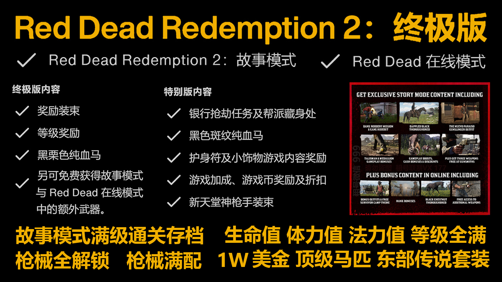 荒野大镖客2✨498元终极版♋东部传说套装✅传说背包✅满配亚瑟⭐生命√体力√法力√全部满级✅1万美金